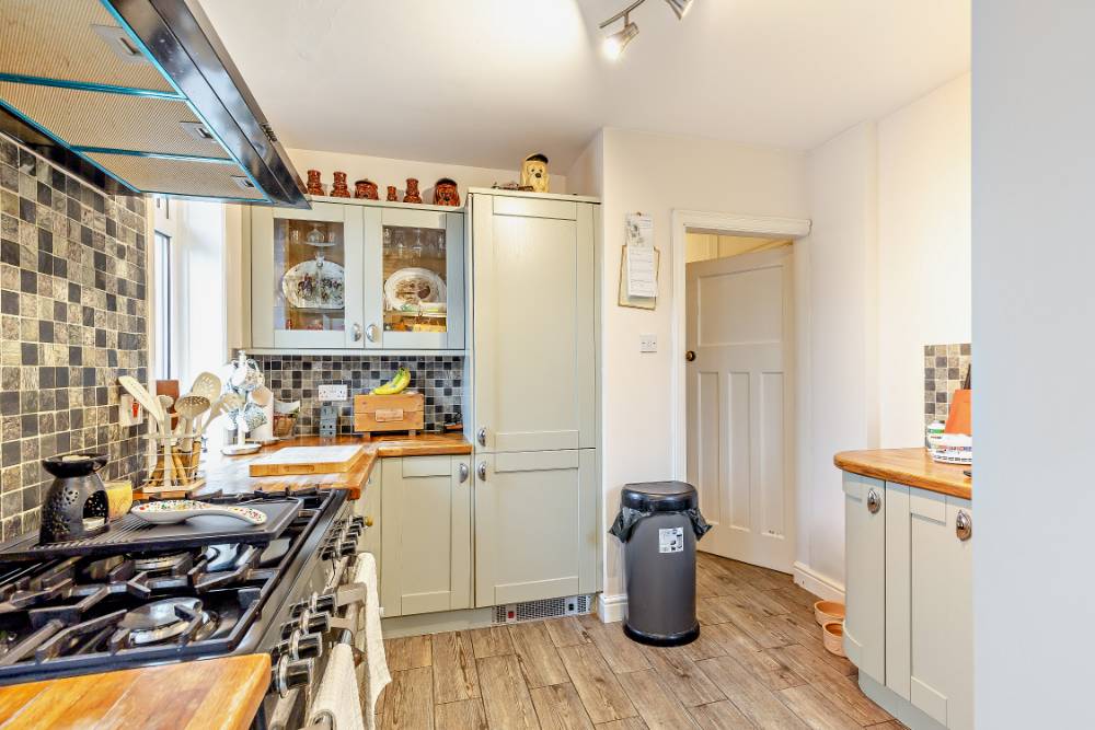 The utility is fitted with storage cupboards and amenities for laundering. It also features tiled walling and from here leads to a door that exits to the back garden via a flight of steps.