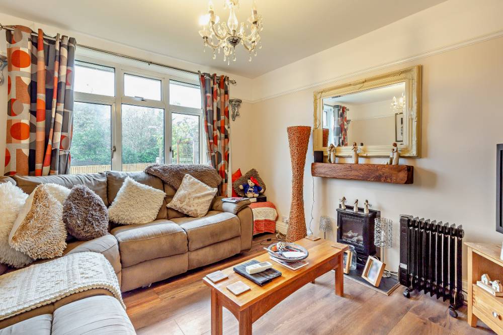 The sitting room features a window with front views, a built-in wood burner fireplace and laminated flooring.