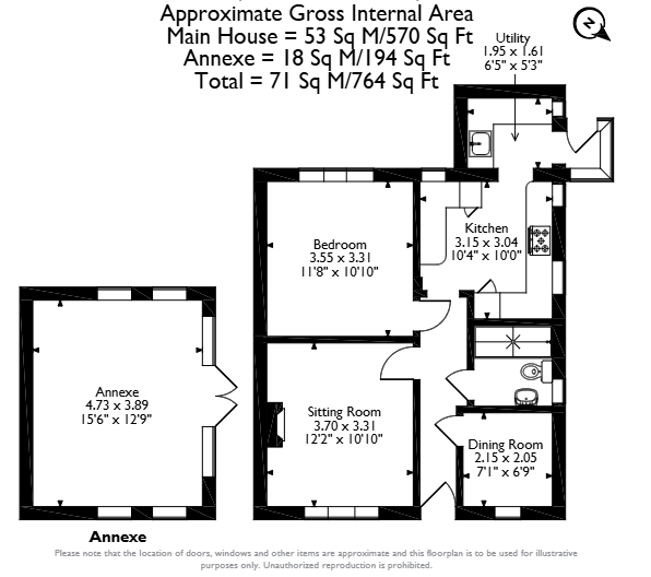The accommodation is well laid out and thoughtfully arranged across a single floor, providing comfortable and practical living space throughout. Internally, the property comprises a welcoming sitting room, a separate dining room ideal for entertaining, a fitted kitchen, a useful utility area, a generously sized bedroom, and a well-appointed bathroom. In addition, the property benefits from a separate utbuilding offering flexible accommodation options such as guest space or a home office.