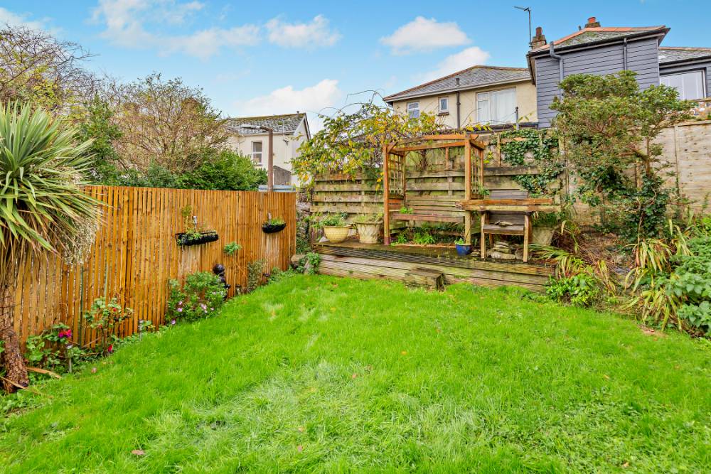 The property is enclosed with stone walling and wood panelling at the front. There is also a garden gate that opens up from the street to flights of steps that lead to the front garden, the entrance door and back garden. The front garden is mostly covered with grass and includes a variety of mature shrubbery, trees and a pergola arbour with seating. The enclosed back garden offers paved garden paths, garden features, leisure areas with seating and a grass covered terrace that includes a variety of shrubbery and potted plants. There is off-street parking provided at the side of the property.