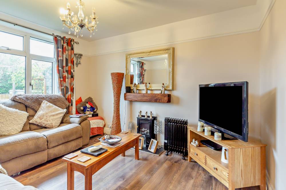 The sitting room features a window with front views, a built-in wood burner fireplace and laminated flooring.