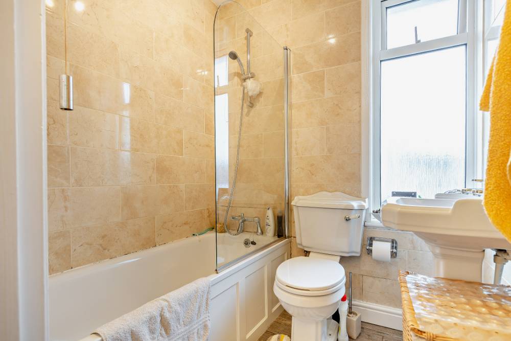 The bathroom is equipped with a toilet, a hand wash basin and bath facilities. It has tiled walling and a side facing window.