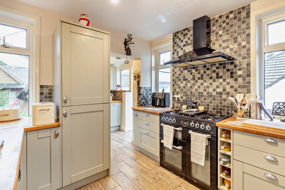 The kitchen is fitted with storage cupboards, built-in utilities, a full stove with two ovens and an extractor hood. More features includes wood look floor tiles, partly tiled walling and windows with side and rear views. The room flows seamlessly to the utility.