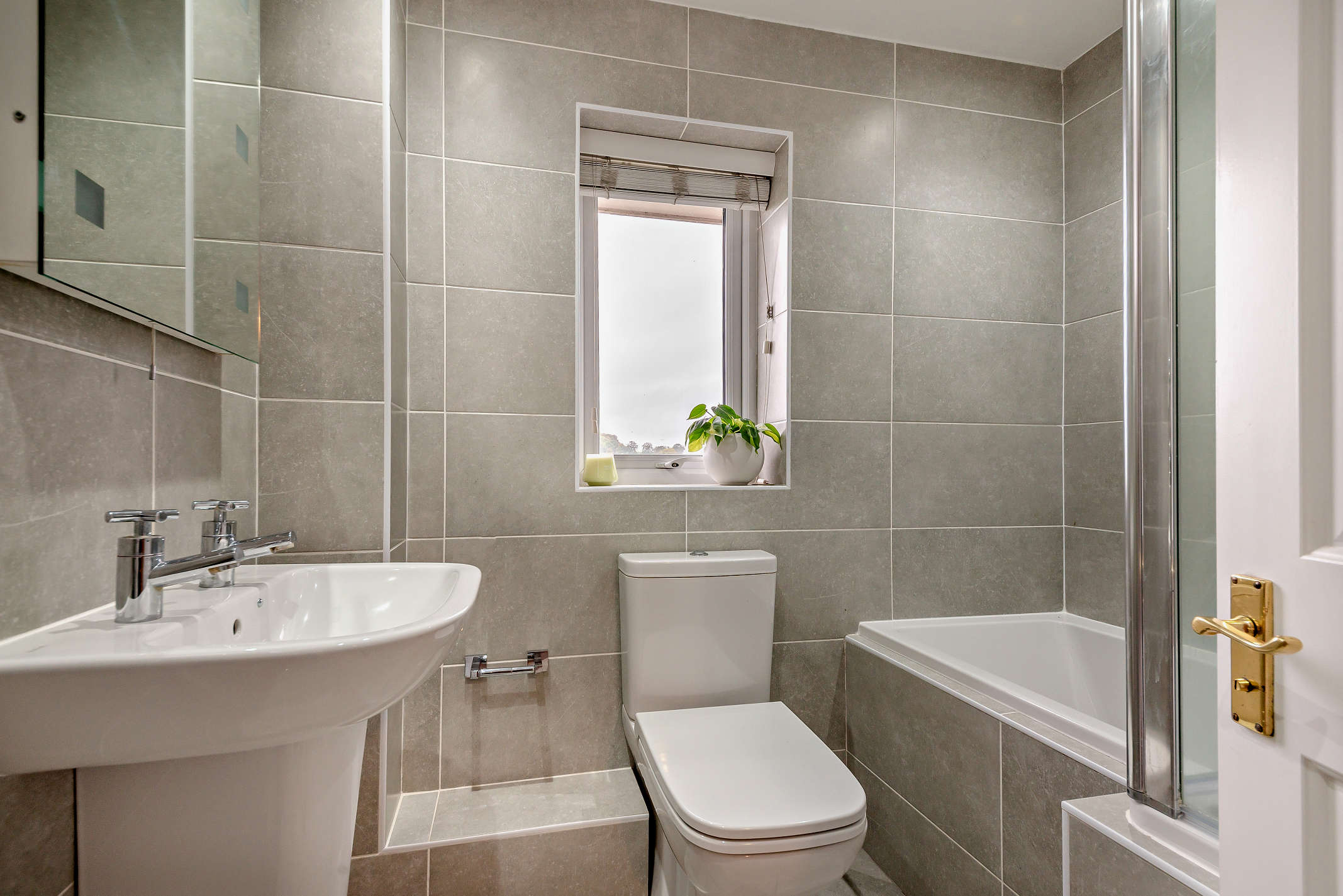 The bathroom is equipped with toilet, hand wash basin and bath facilities. It has a front facing window and finished with attractive tiling throughout.
