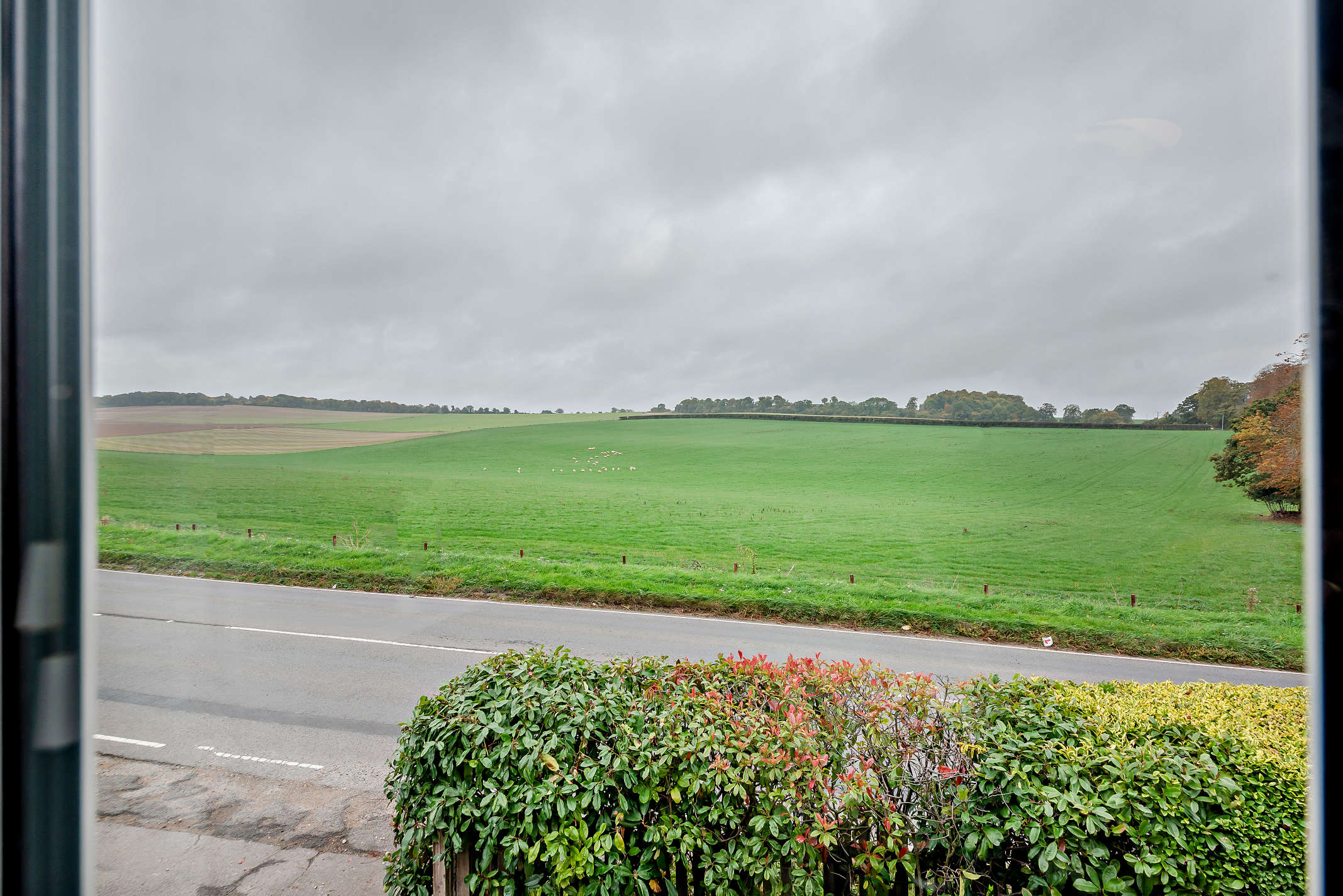 To the front of the property, there is a small lawn, path, and attractive hedging along with stunning views.