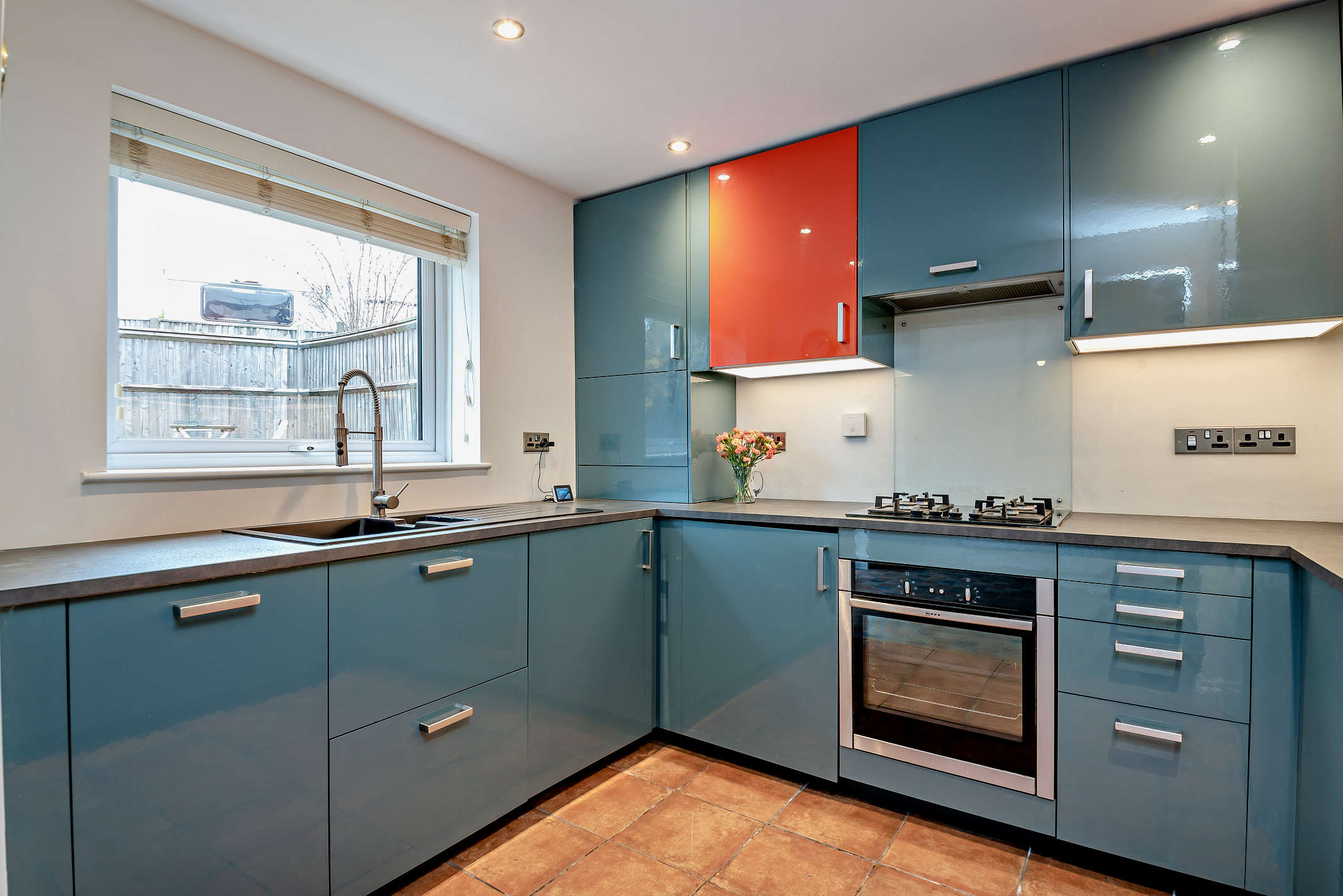The modern kitchen is fitted with storage cupboards and built-in utilities, including an oven, hob and extractor fan. Other features includes tiled flooring and a window with views to the back garden.