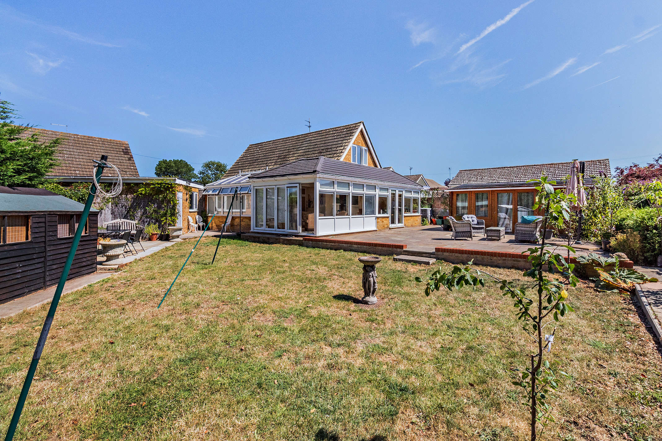 The property is approached over a block-paved driveway leading to the pedestrian access gate to the rear garden and the main entrance. The enclosed, rear garden is spacious and well-presented with a large, paved patio with adjoining lawn space and planting to the borders. To the edges of the garden, there are three further seating terraces, two storage sheds, a hobby room and a greenhouse.