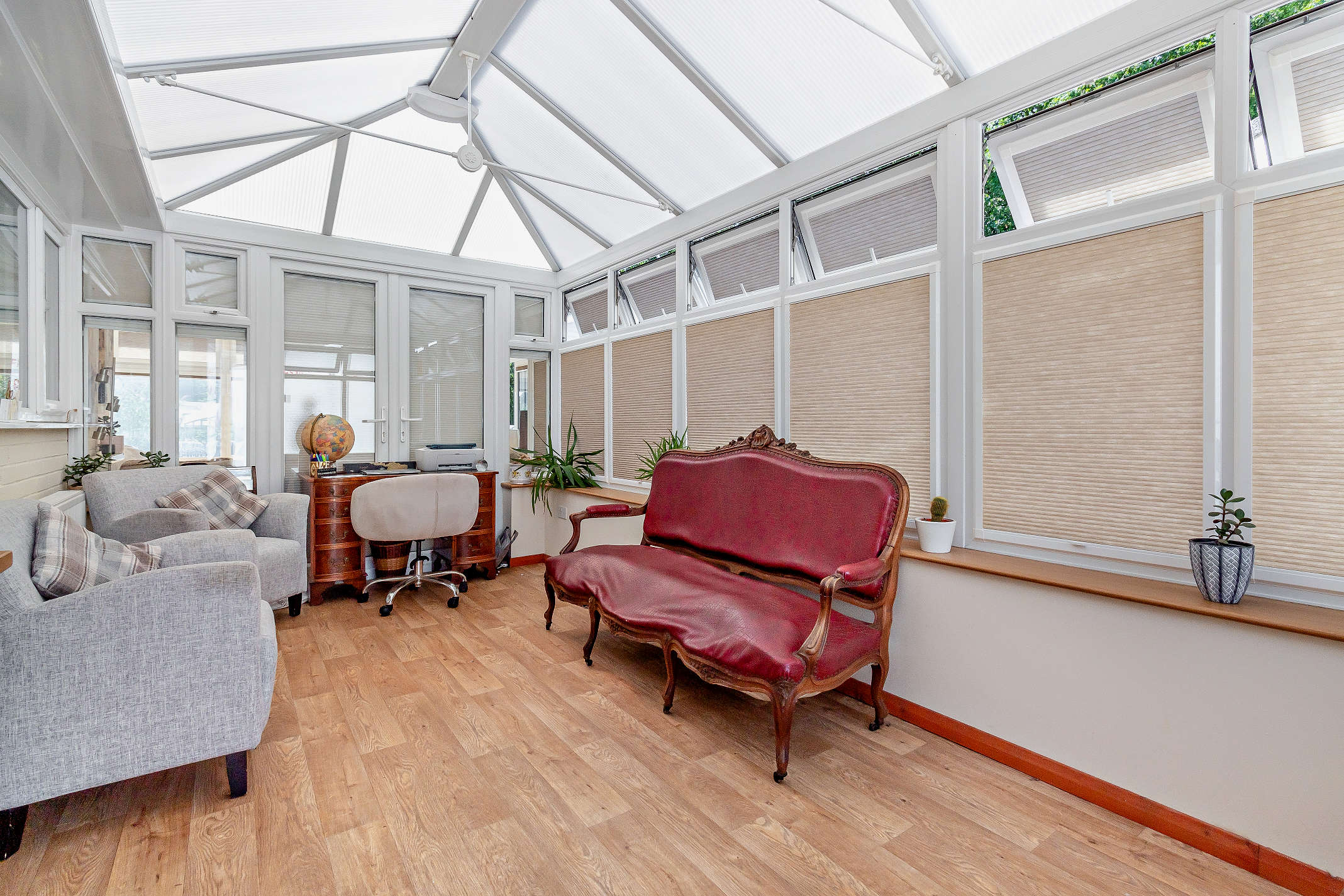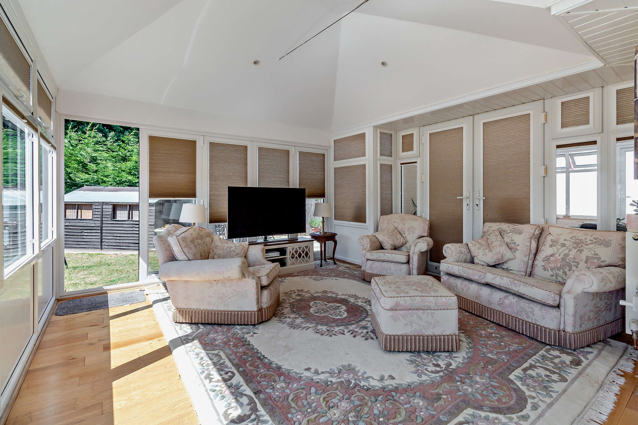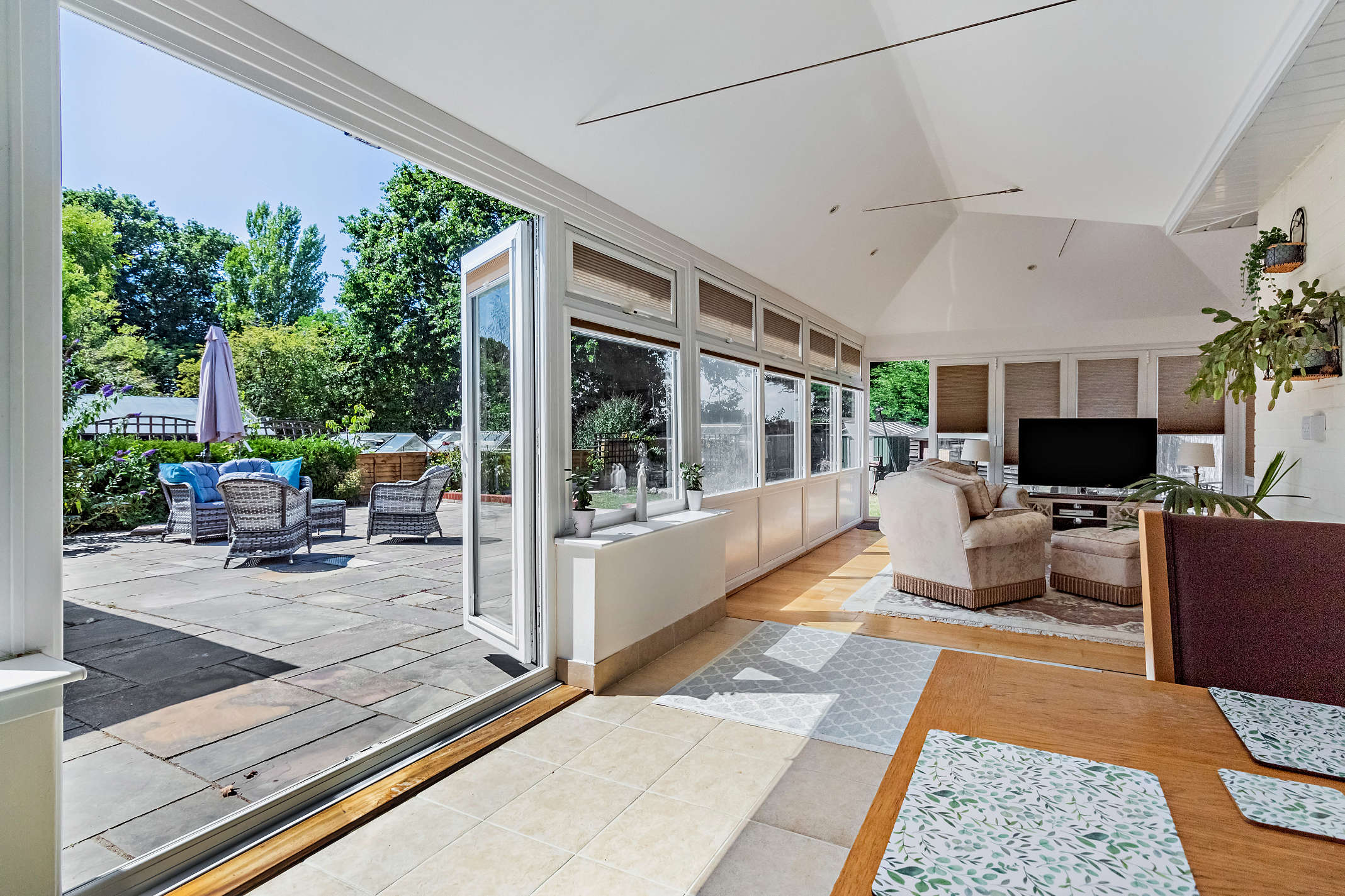This light-filled reception room provides space for both lounge and dining furniture, along with additional storage cabinets. It enjoys a dual aspect over the garden, features part-tiled and part wood-style flooring, and includes integrated blinds to the windows. Two pairs of French doors open onto the paved patio, ideal for al fresco dining.