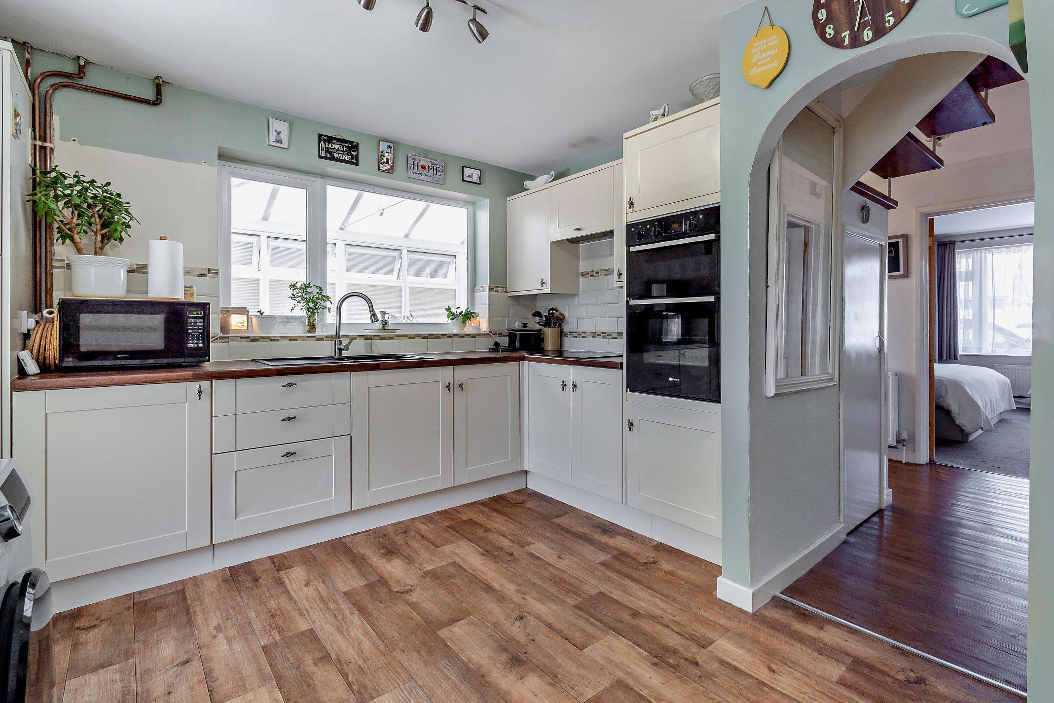 This is a spacious room with a triple aspect view and a vaulted ceiling allowing for plentiful natural light. The room offers wooden-style flooring throughout, French doors open from here to the lounge/diner and a main entrance door opens to the front driveway.