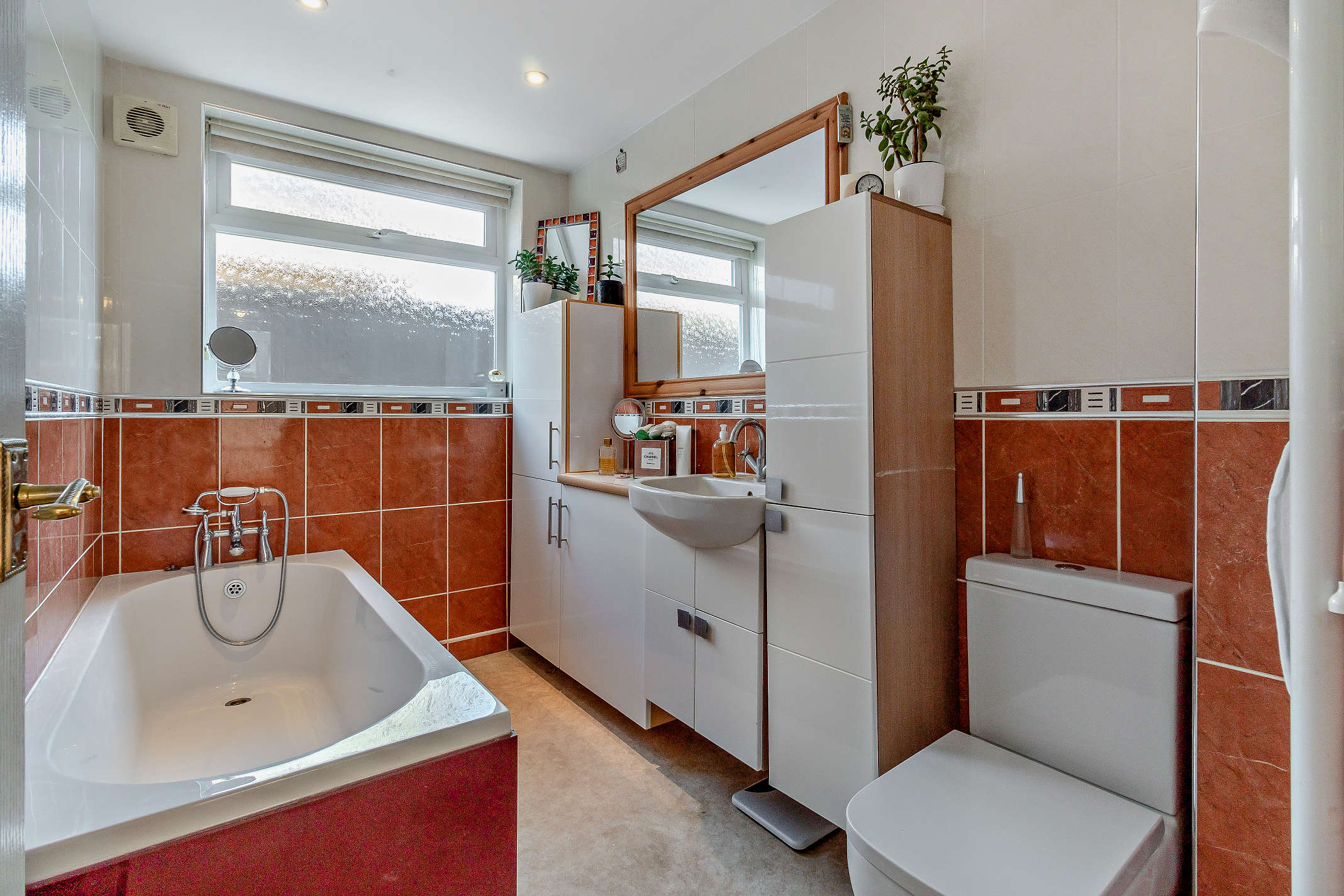 This ground floor bathroom offers a three-piece bathroom suite with white vanity washbasin and integrated storage, bath and WC.