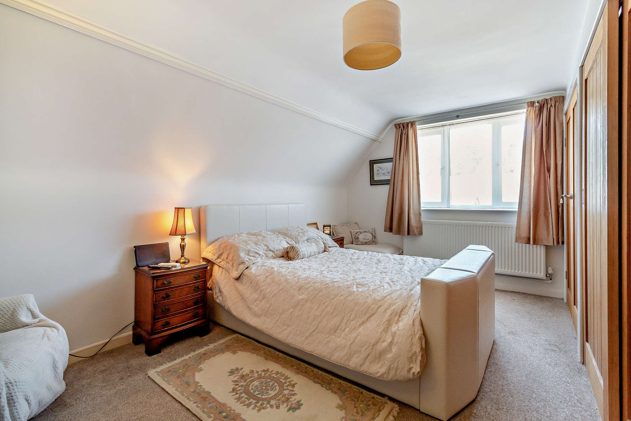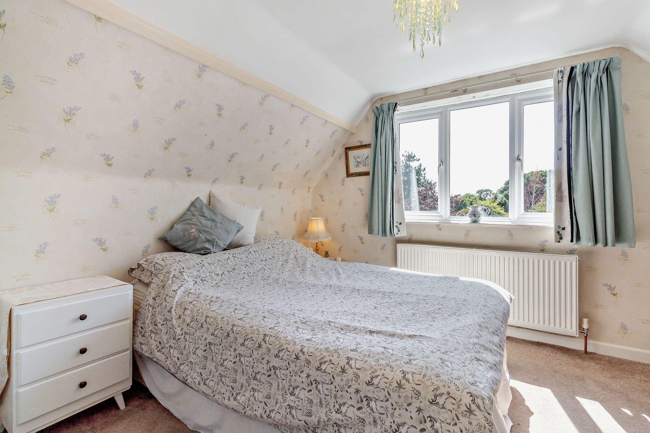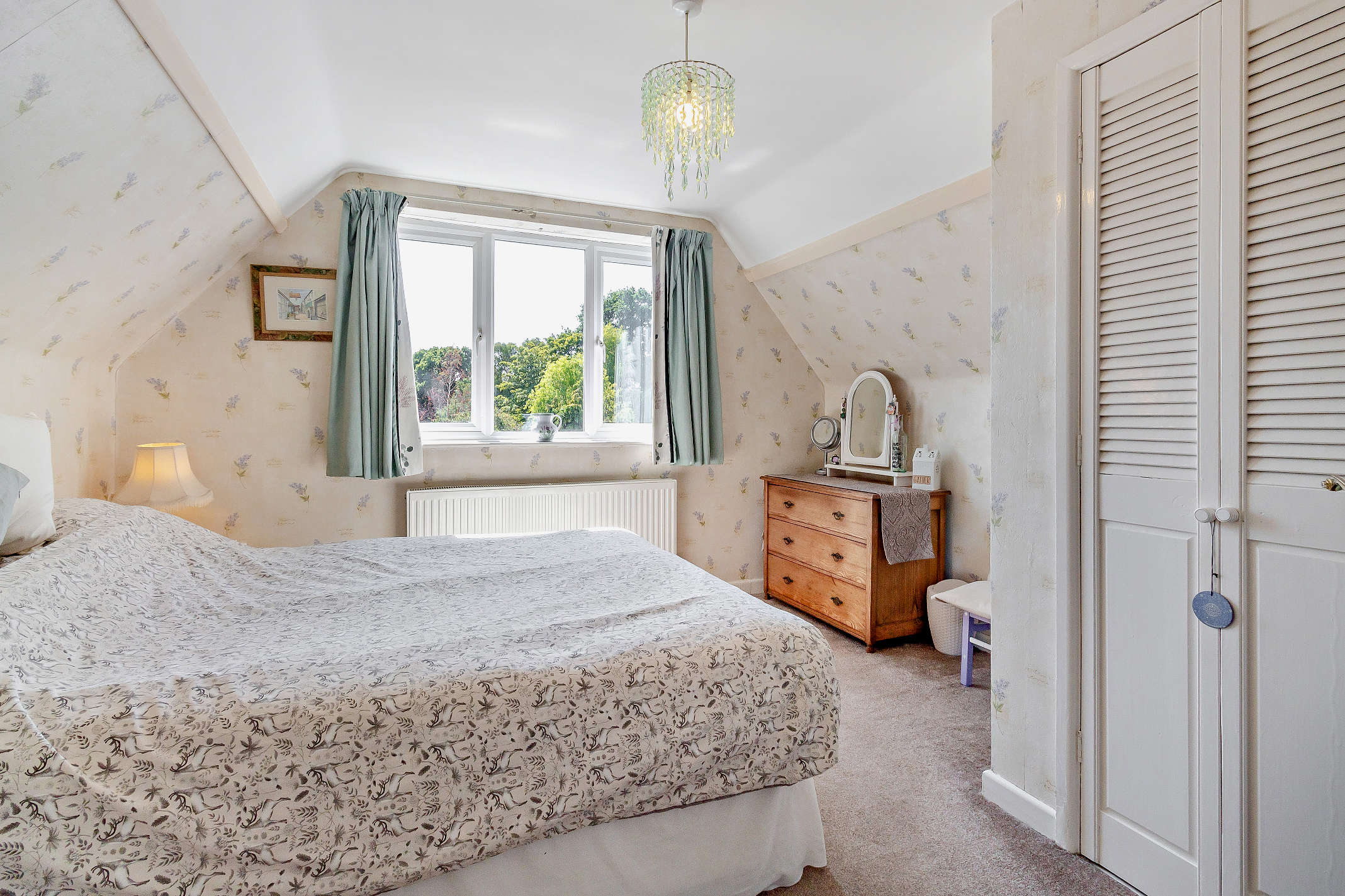This is a well-proportioned bedroom with in-built storage, carpeted flooring and garden views.