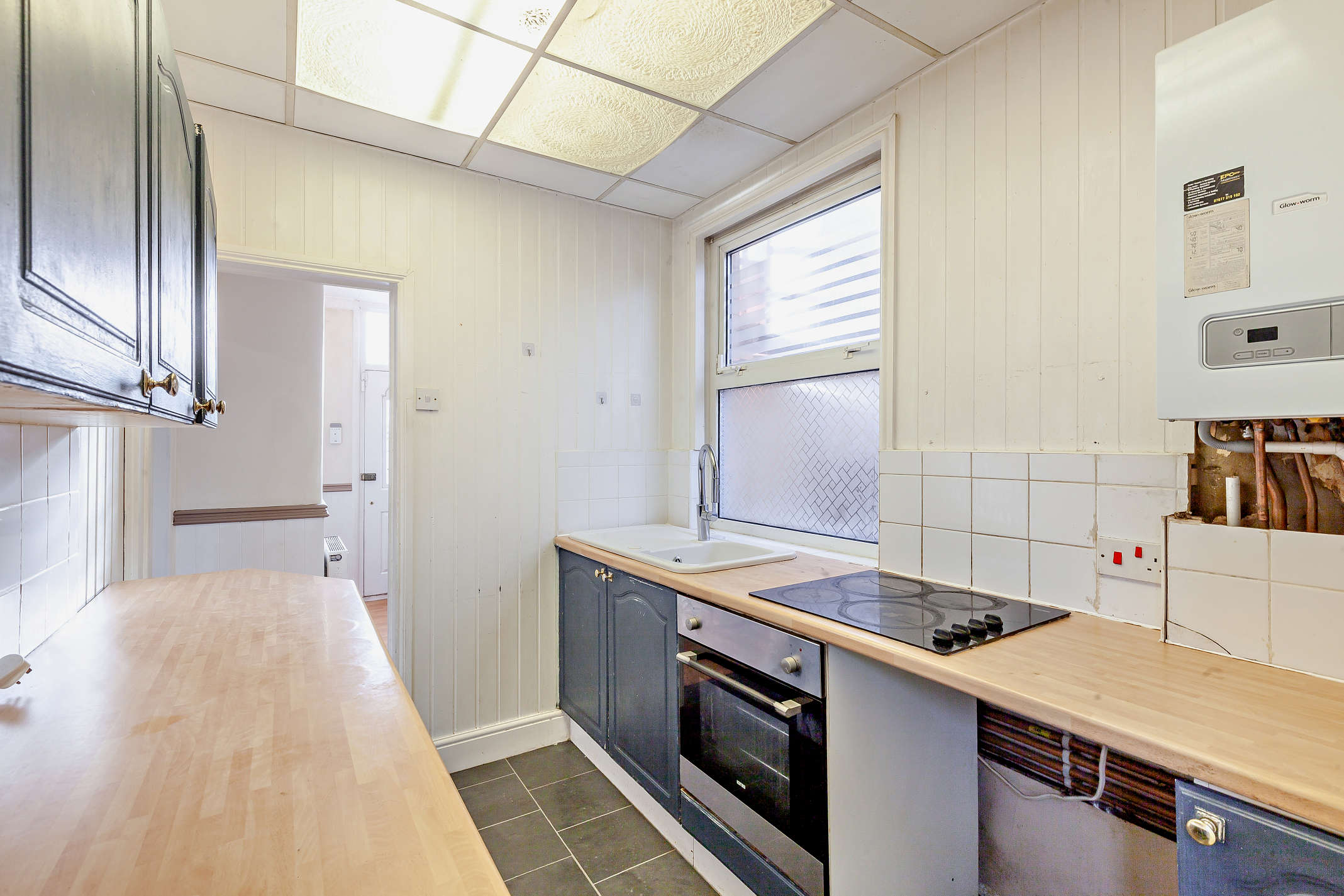 The kitchen is fitted with storage cupboards and built-in utilities, including an oven and hob.