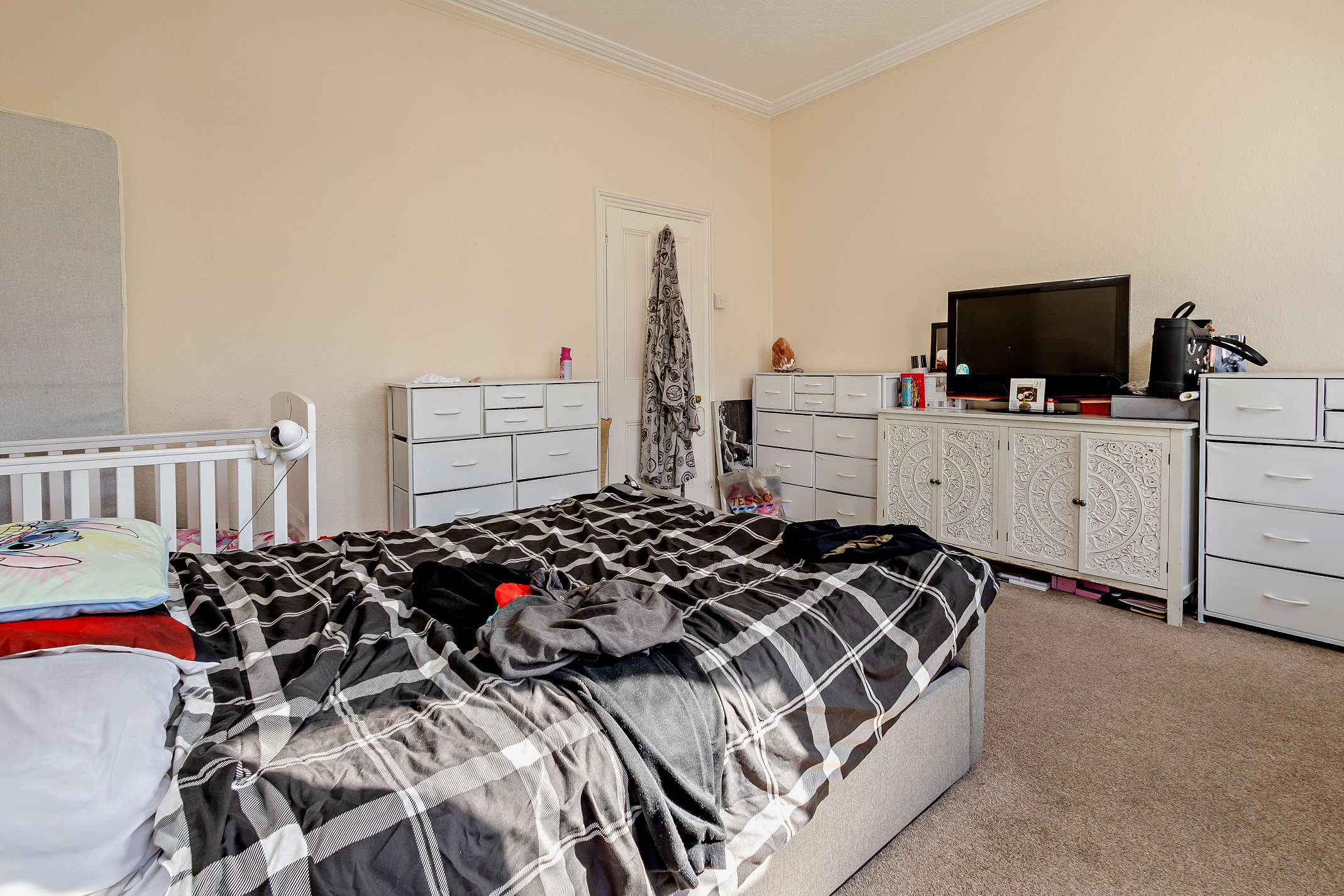 This spacious double bedroom offers windows with front views and carpeted flooring.