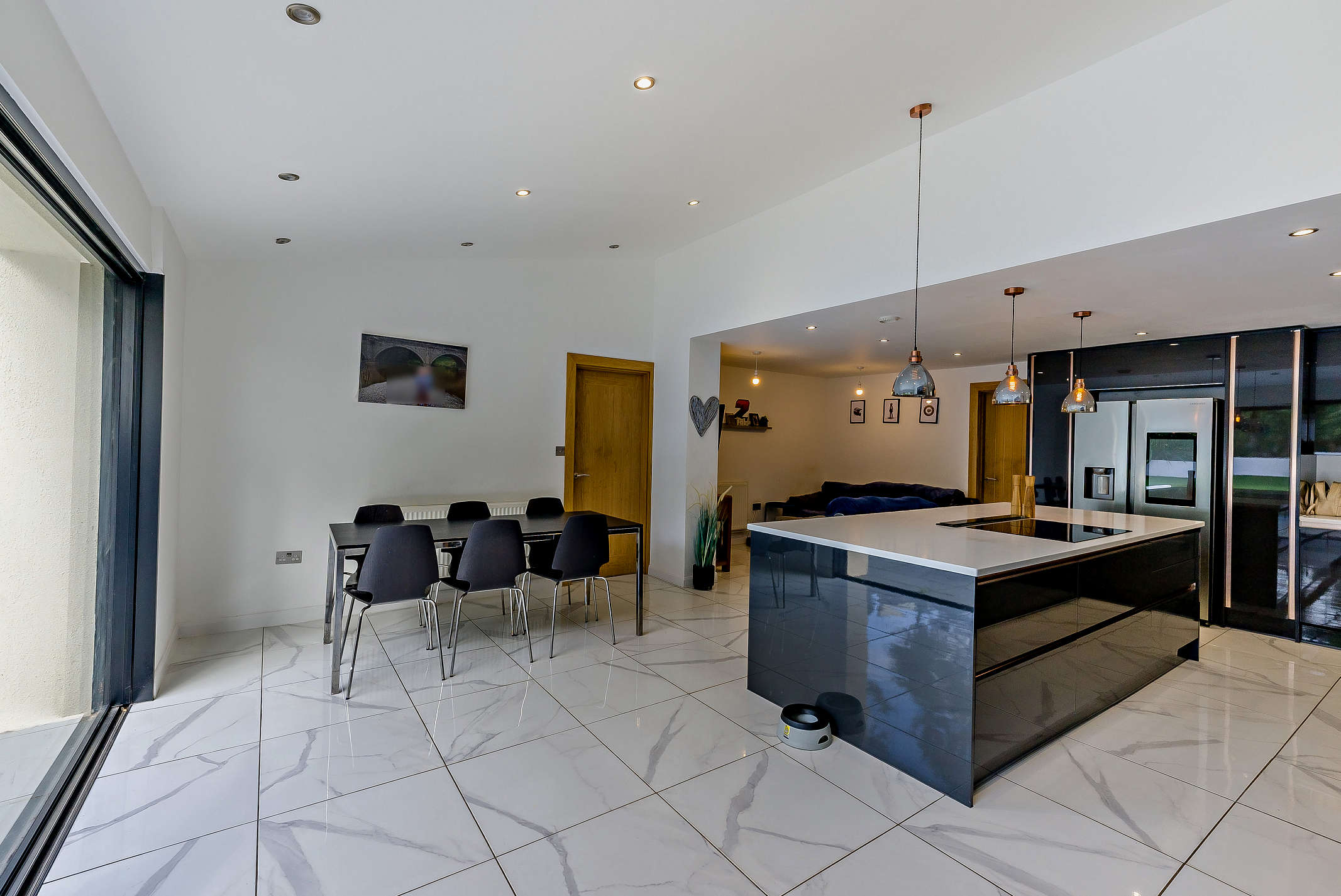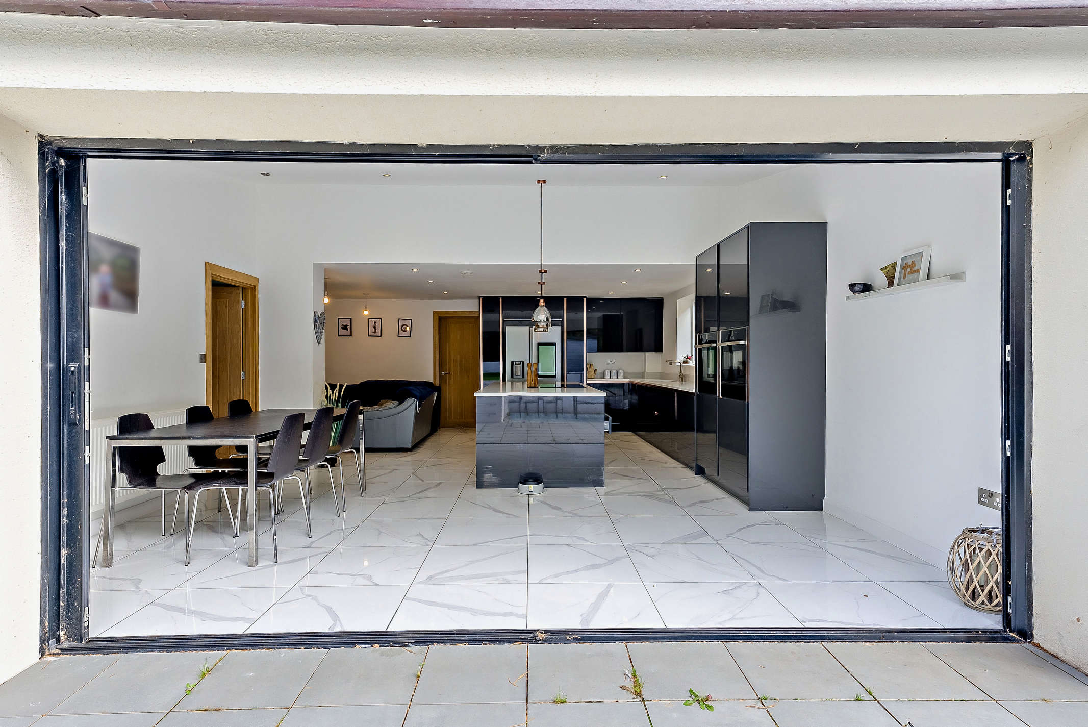 This open-plan social space features a kitchen with ample wall and base cabinets, integrated appliances, and a feature island with additional storage and appliance space beneath focused lighting. The dining area overlooks the garden, with bi-fold doors opening onto the paved terrace.
