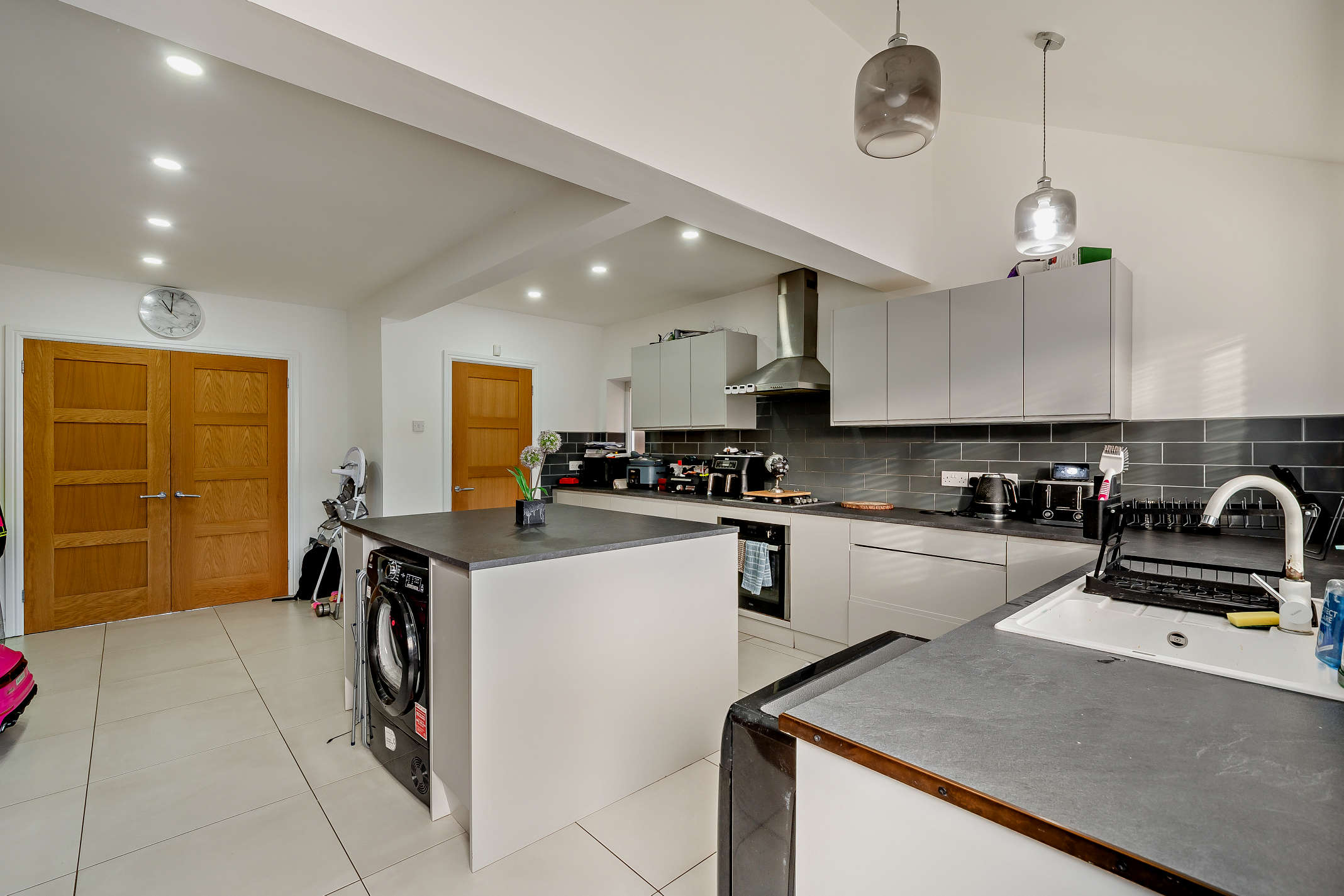 The generously sized kitchen is fully-fitted with white storage cupboards and built-in utilities, including an oven, gas hob and extractor fan. The room is finished with black wall tiles which gives the room its unique and modern style.