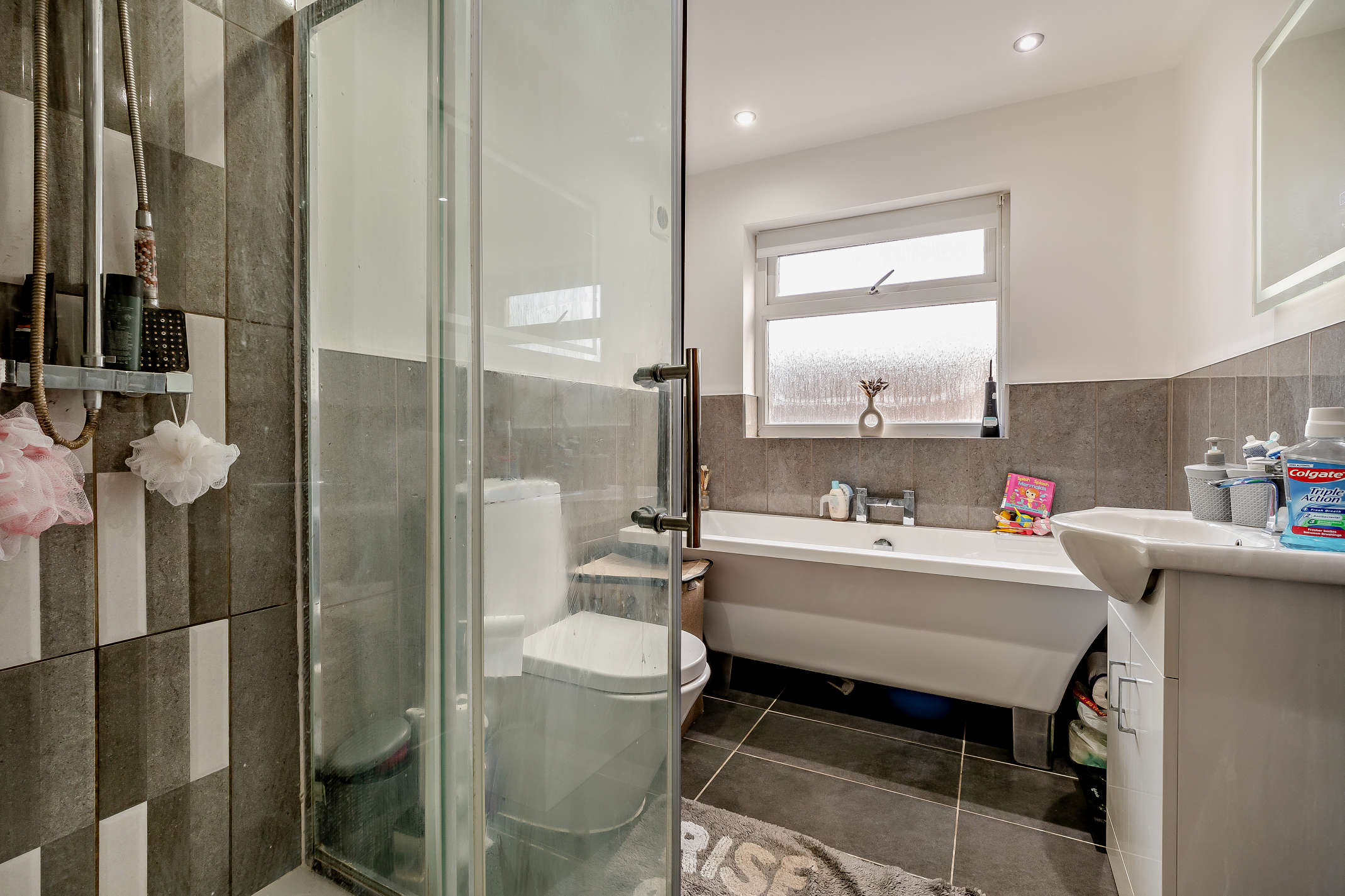 The bathroom is equipped with bath and shower facilities, a wash hand basin and a toilet.