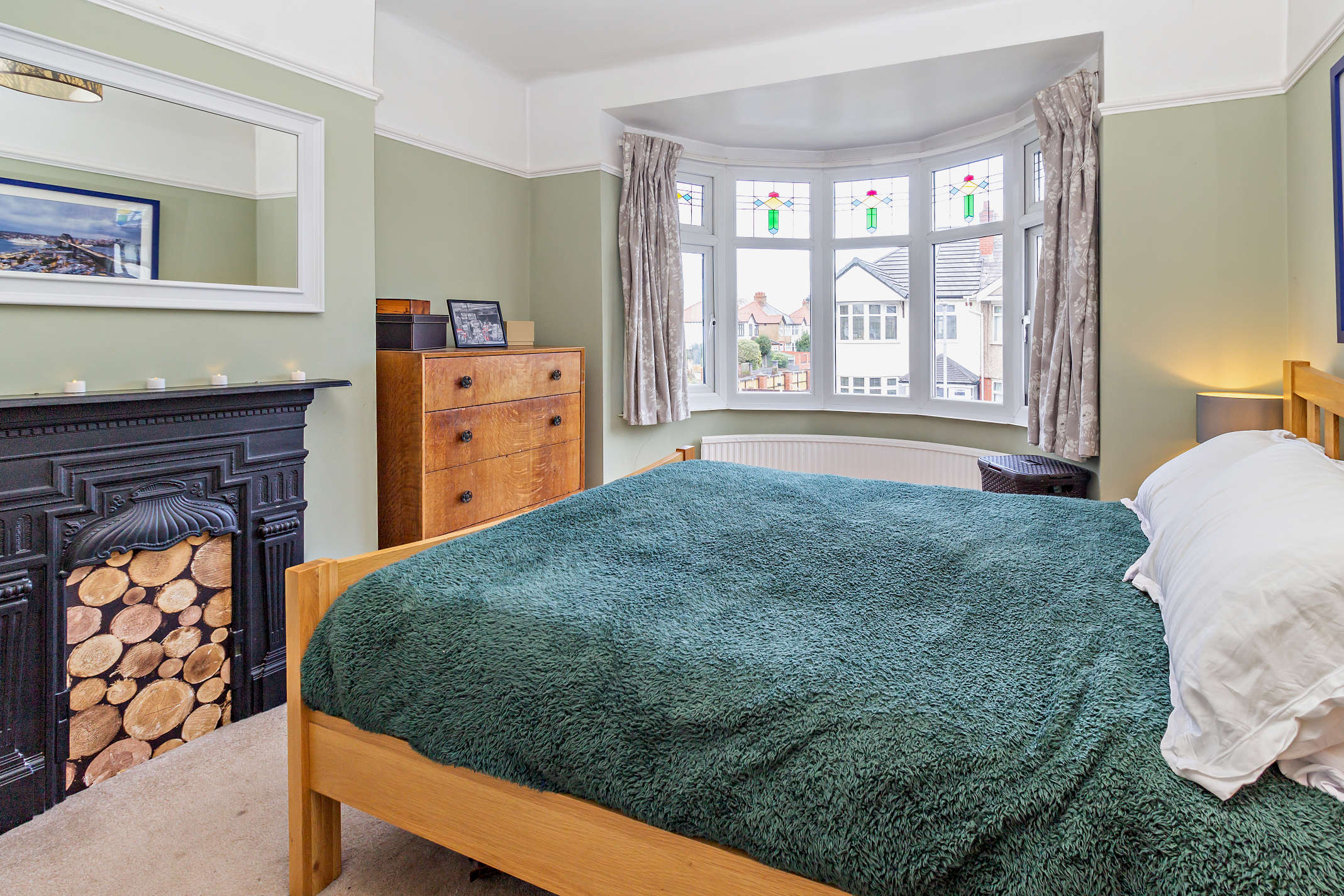 Bedroom one is a double room featuring a period fireplace, a front-aspect bay window and carpeted flooring.
