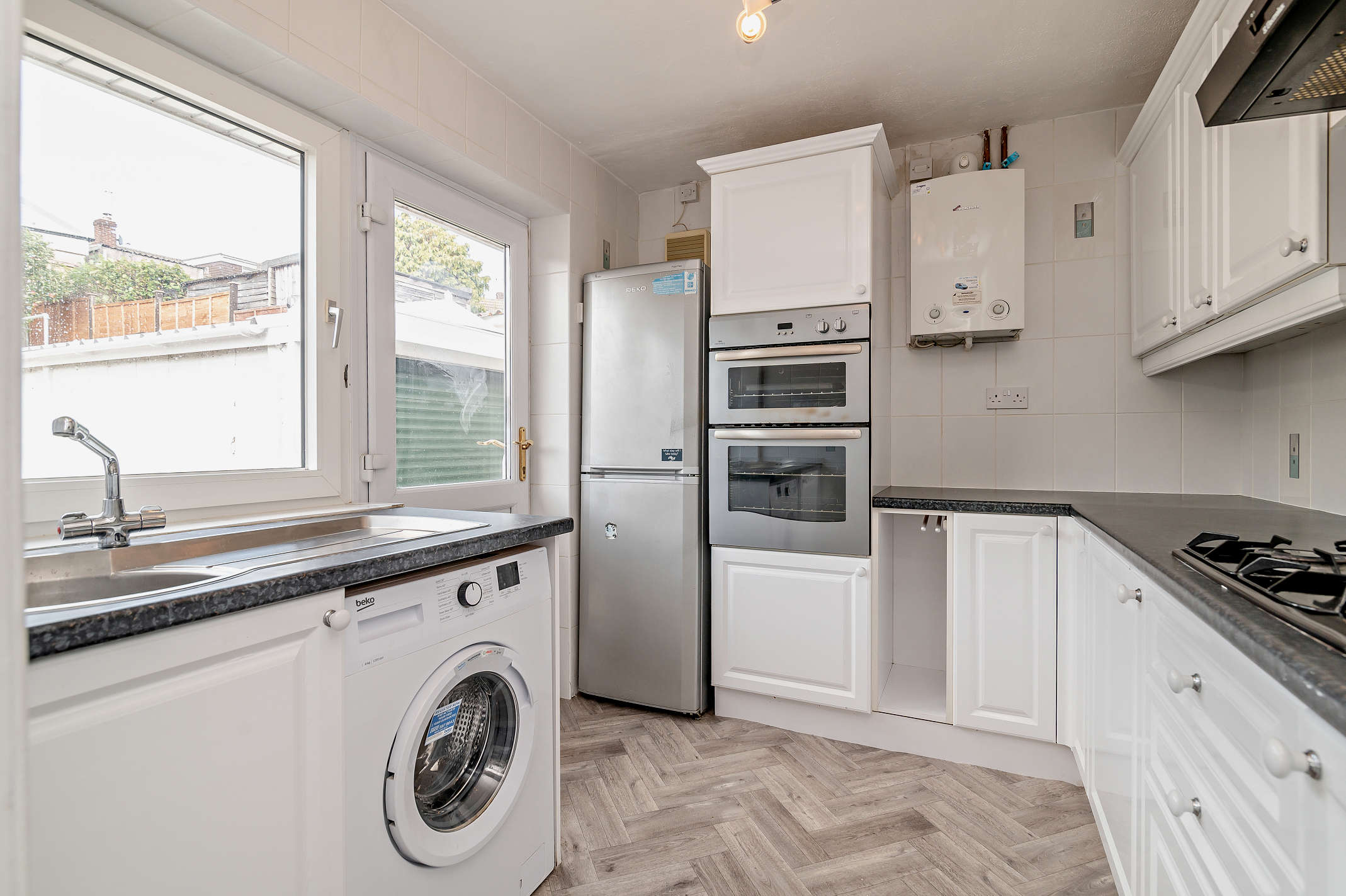 The kitchen is a good size with ample wall and base cabinets with integrated appliances. There is also space for under worktop and free-standing appliances and a door opens from the kitchen to the driveway.