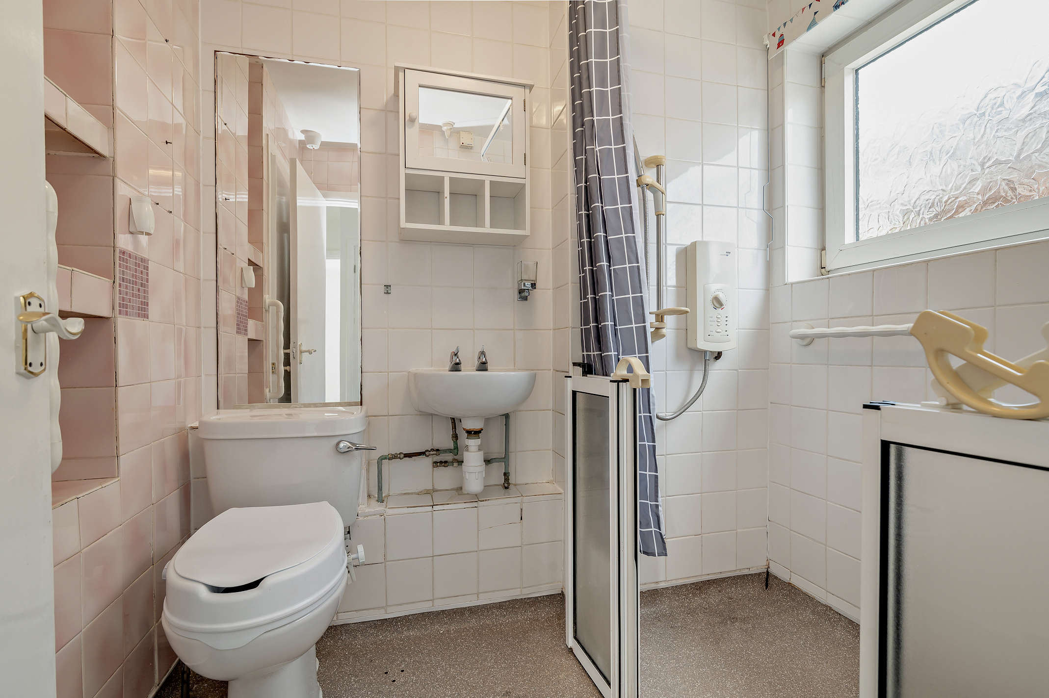 The bathroom offers a three-piece bathroom suite and in-built storage with an accessible cubicle with electric shower, white WC and washbasin.