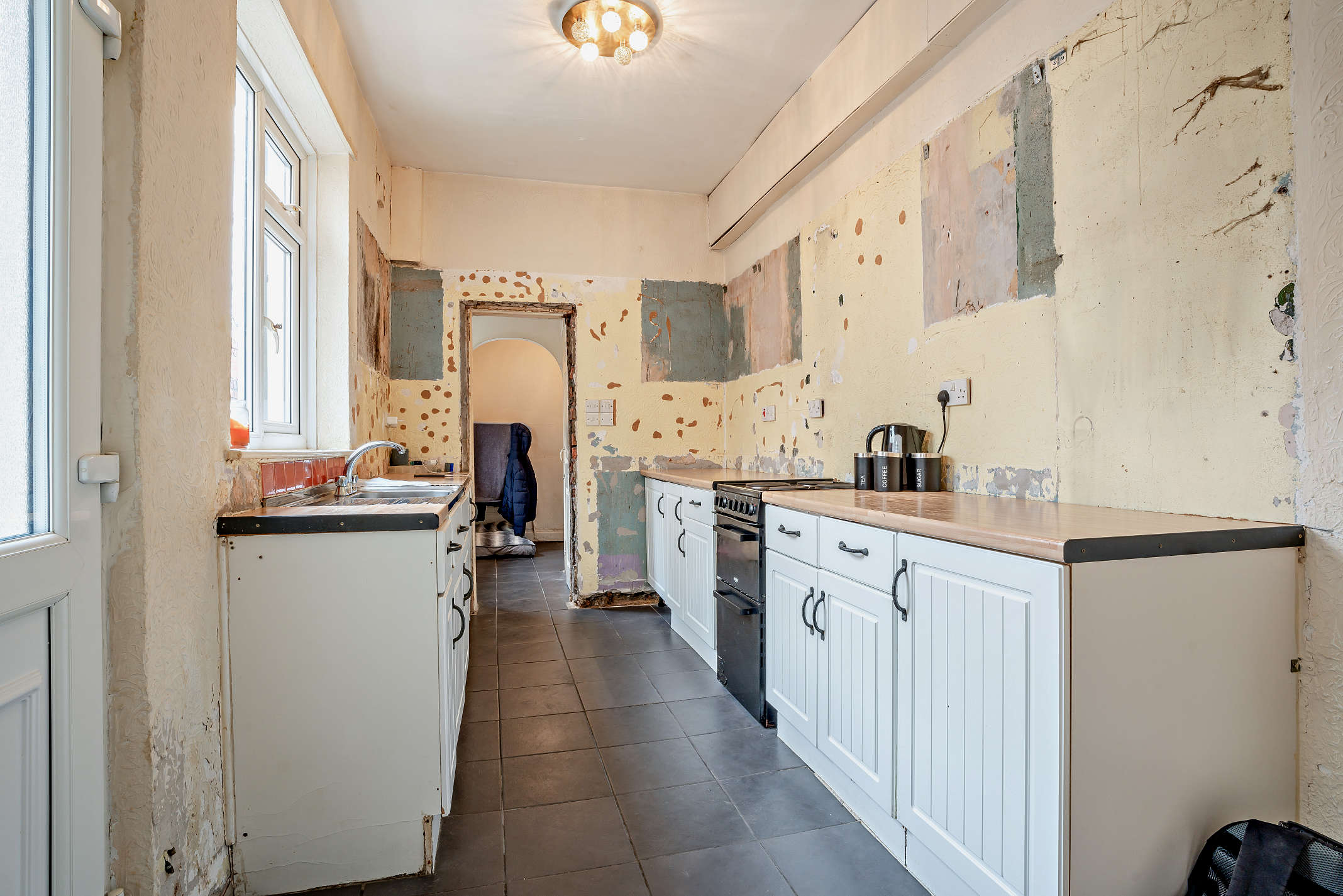 This is a large kitchen with drawer and base cabinets. The buyer has the opportunity to create a bespoke kitchen of their own to complete the refurbishment. From the kitchen, doors opens to the garden and an adjoining lobby area with in-built storage and a utility.