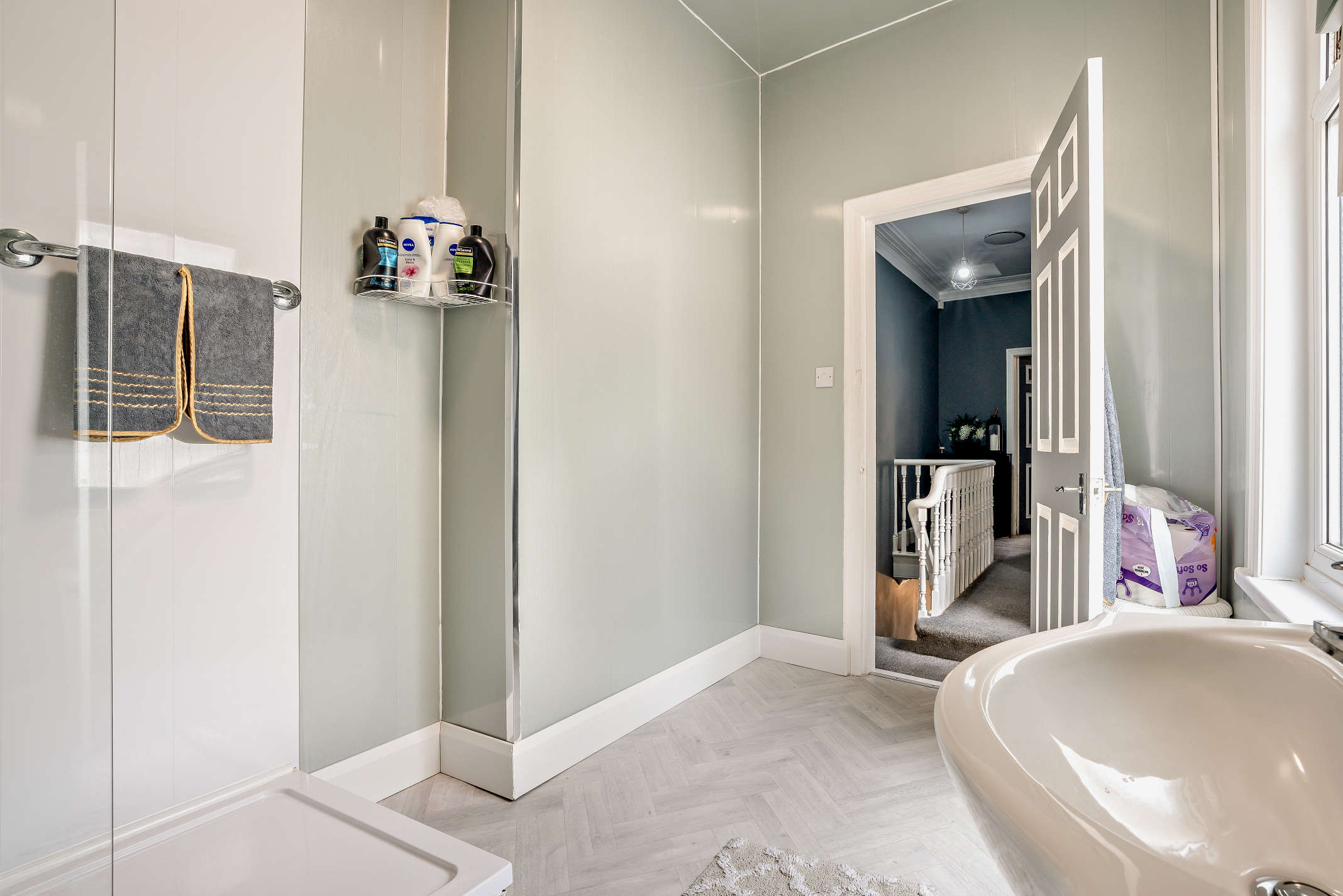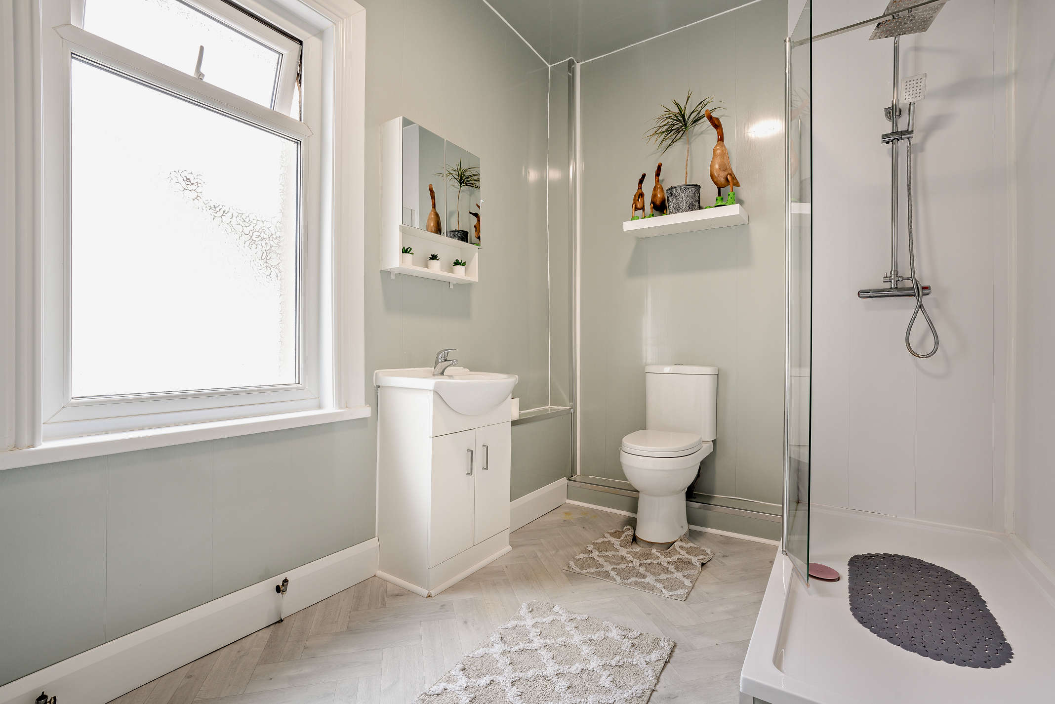 The bathroom comprises a white vanity washbasin with integrated storage, WC and walk-in dual rainfall shower.