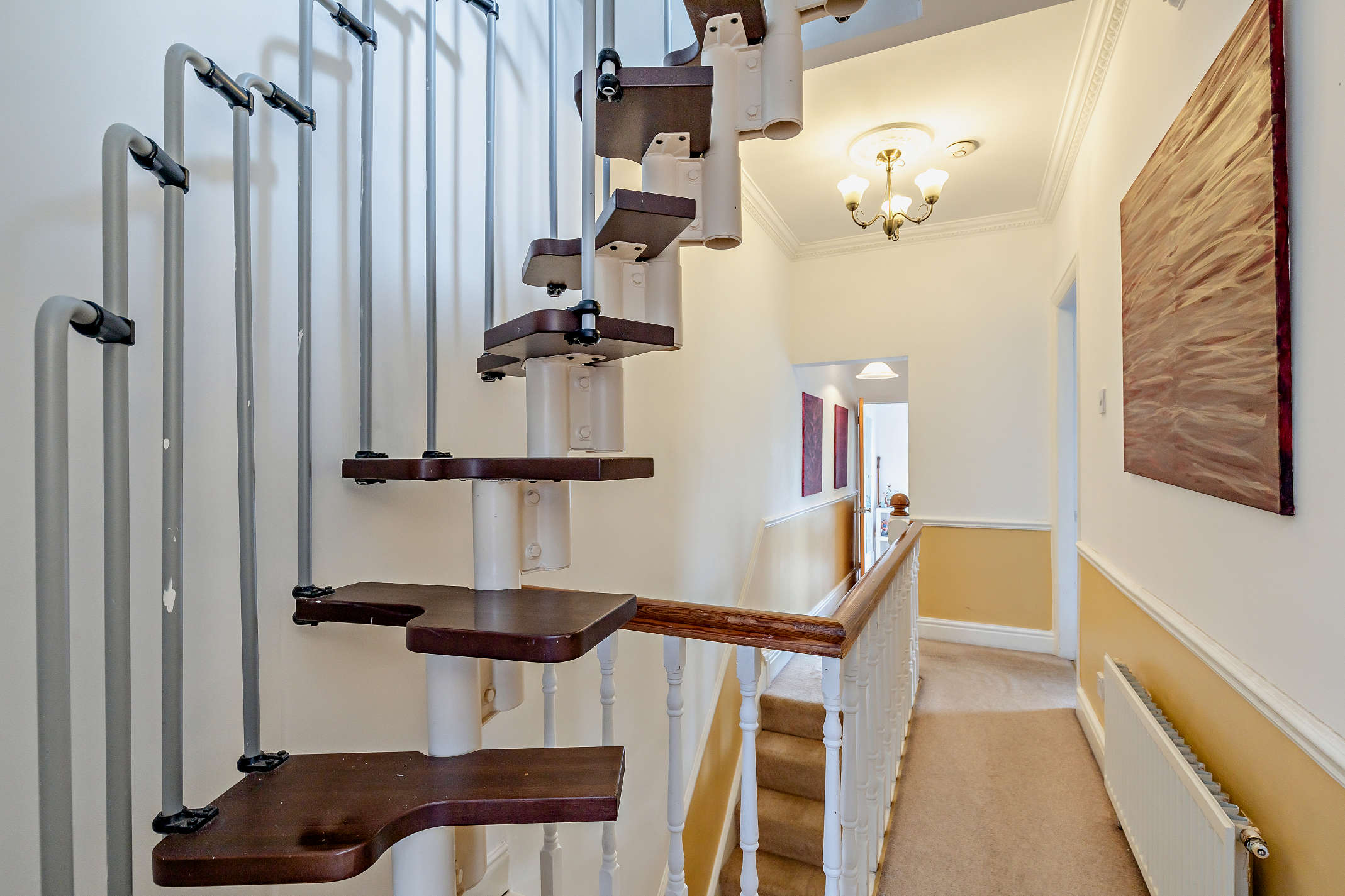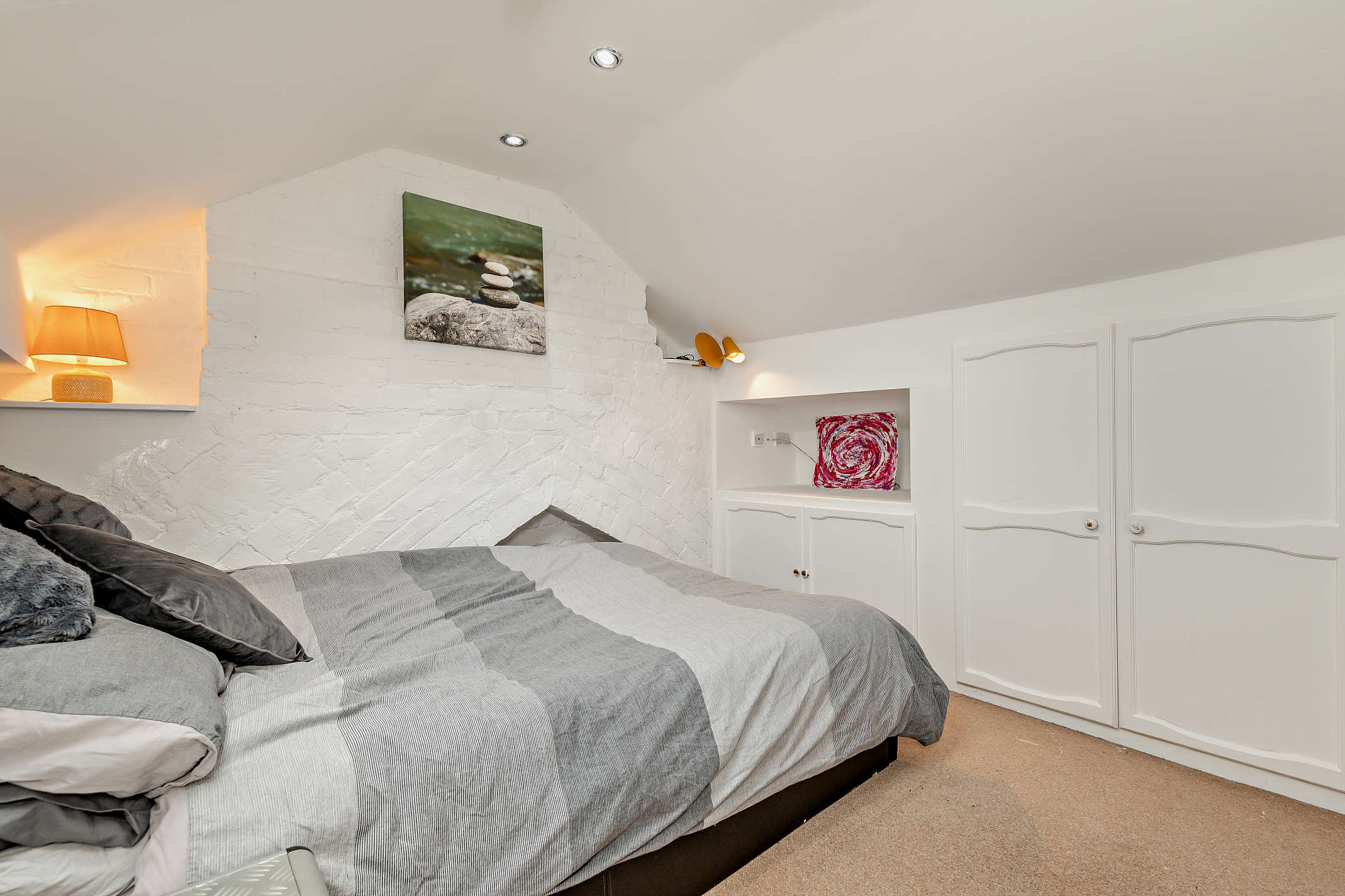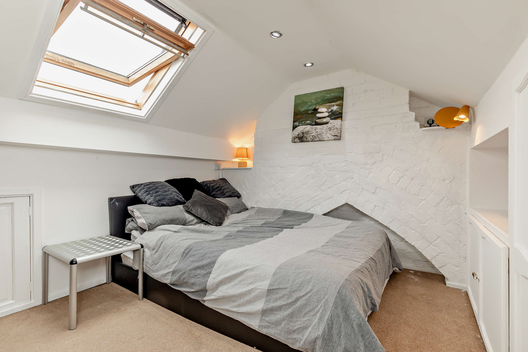 On the second floor is a spacious attic room with in-built storage and a skylight window.