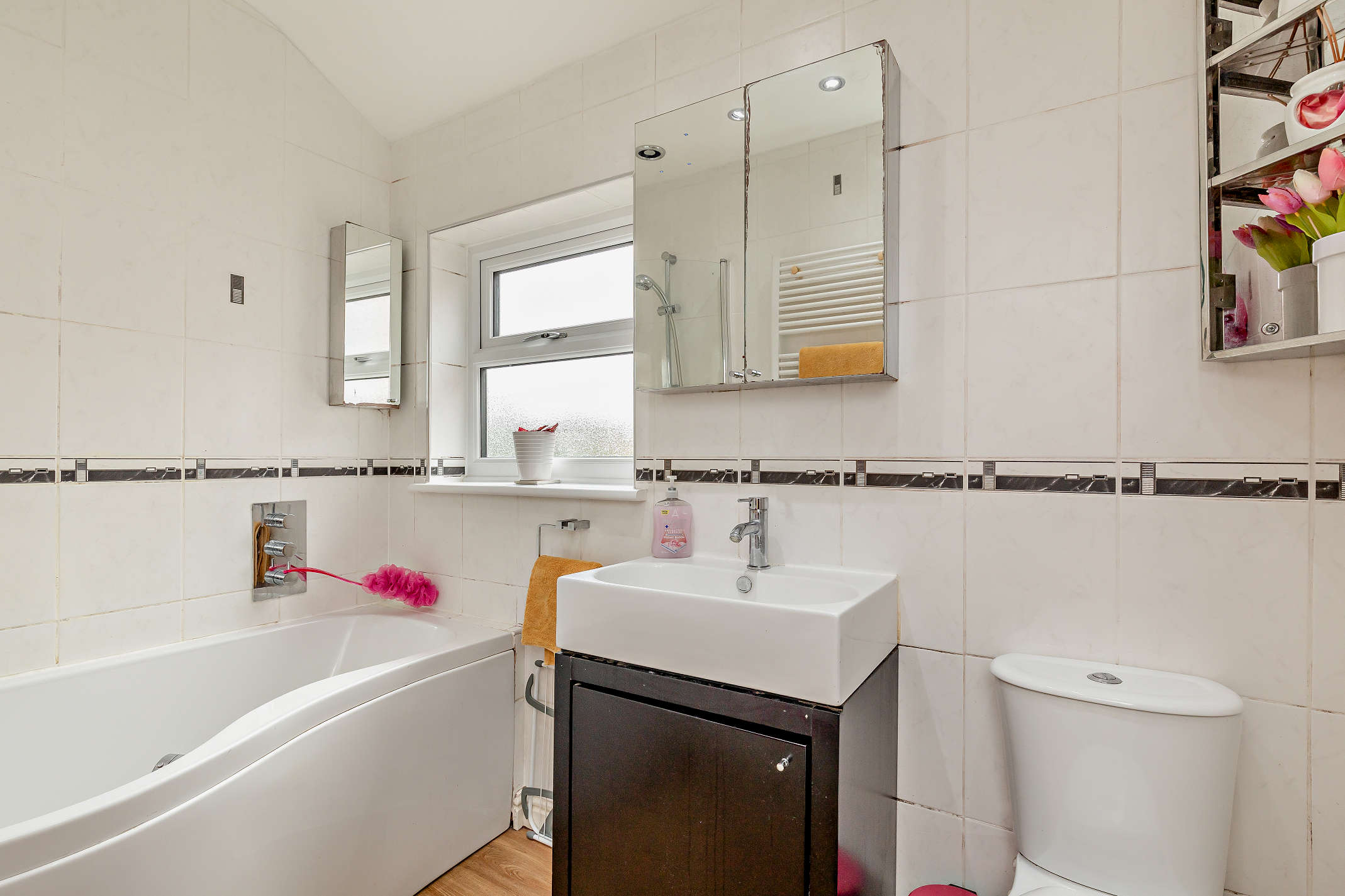 The tiled bathroom has a white three-piece bathroom suite with a shaped bath, vanity washbasin with integrated storage and a WC
