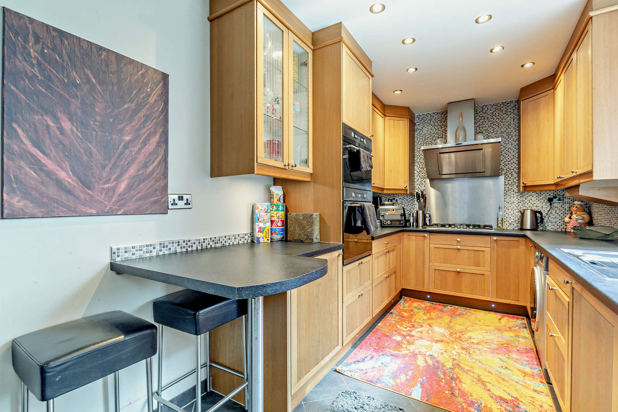 The generous, stylish kitchen opens to the garden and offers wall and base cabinets with modern integrated appliances, co-ordinating wall and floor tiling and a stainless-steel extractor hood.