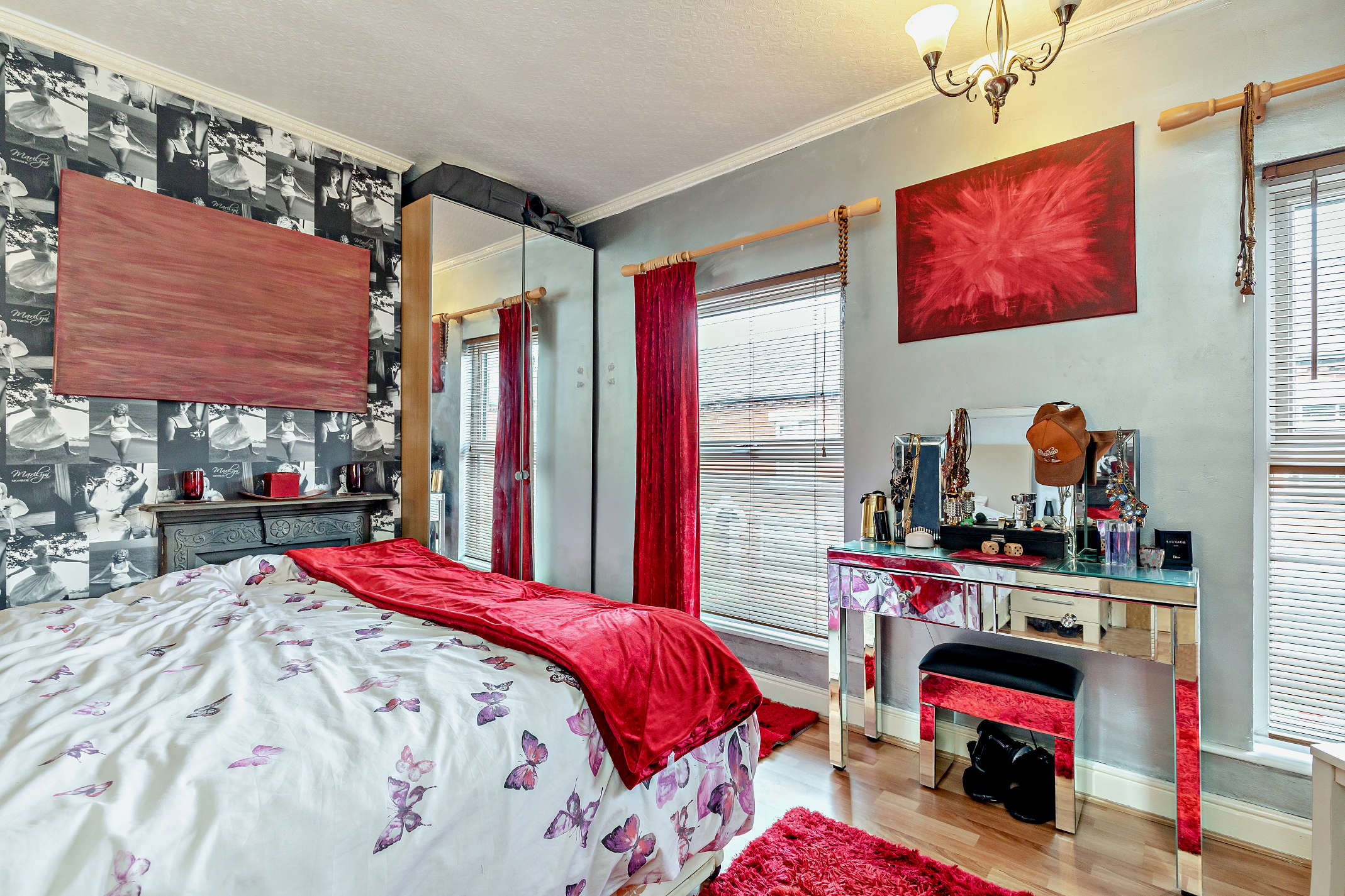 On the first floor, this spacious double bedroom offers two windows, a feature fireplace, laminate flooring and a front aspect view.