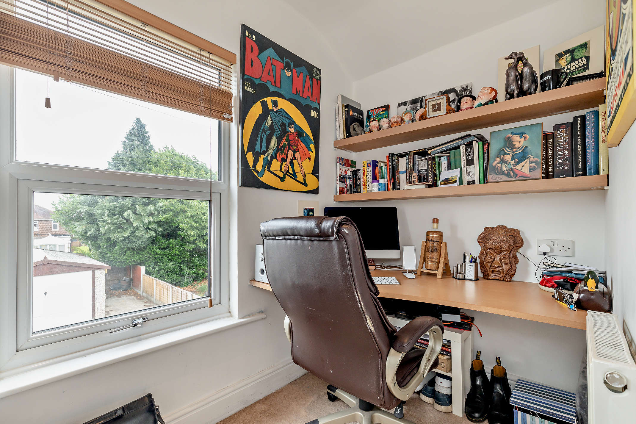This single bedroom offers carpeted flooring and garden views, currently used as a study