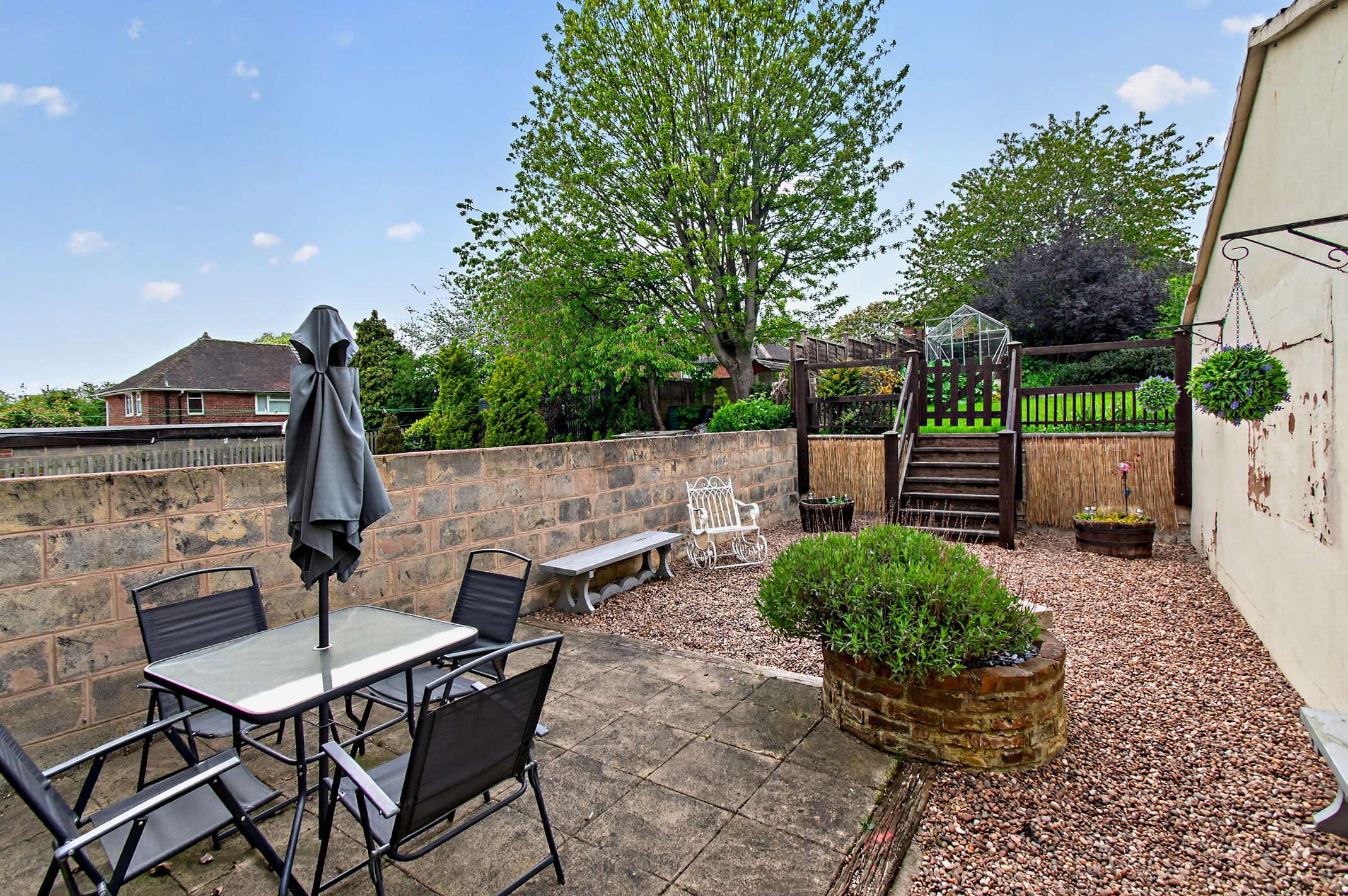 At the front of the property there is a paved area with a boundary wall and gated access. The tiered rear garden includes a paved patio for outdoor seating, a gravelled area, and a well-maintained lawn featuring a greenhouse and mature shrubbery.