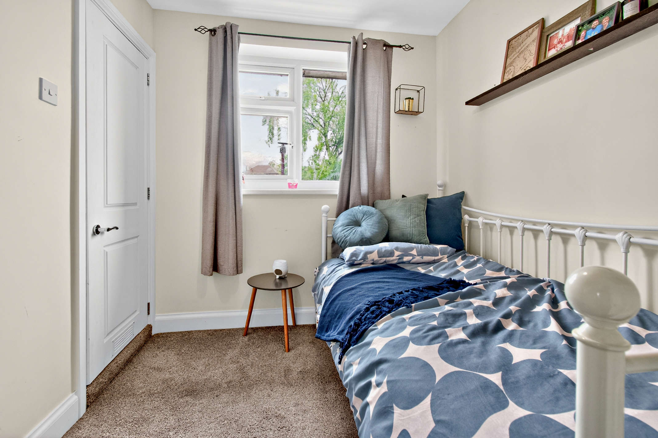 This bedroom is a single with carpeted flooring and built in storage space. It could be purposed as a home office or dressing room if required.