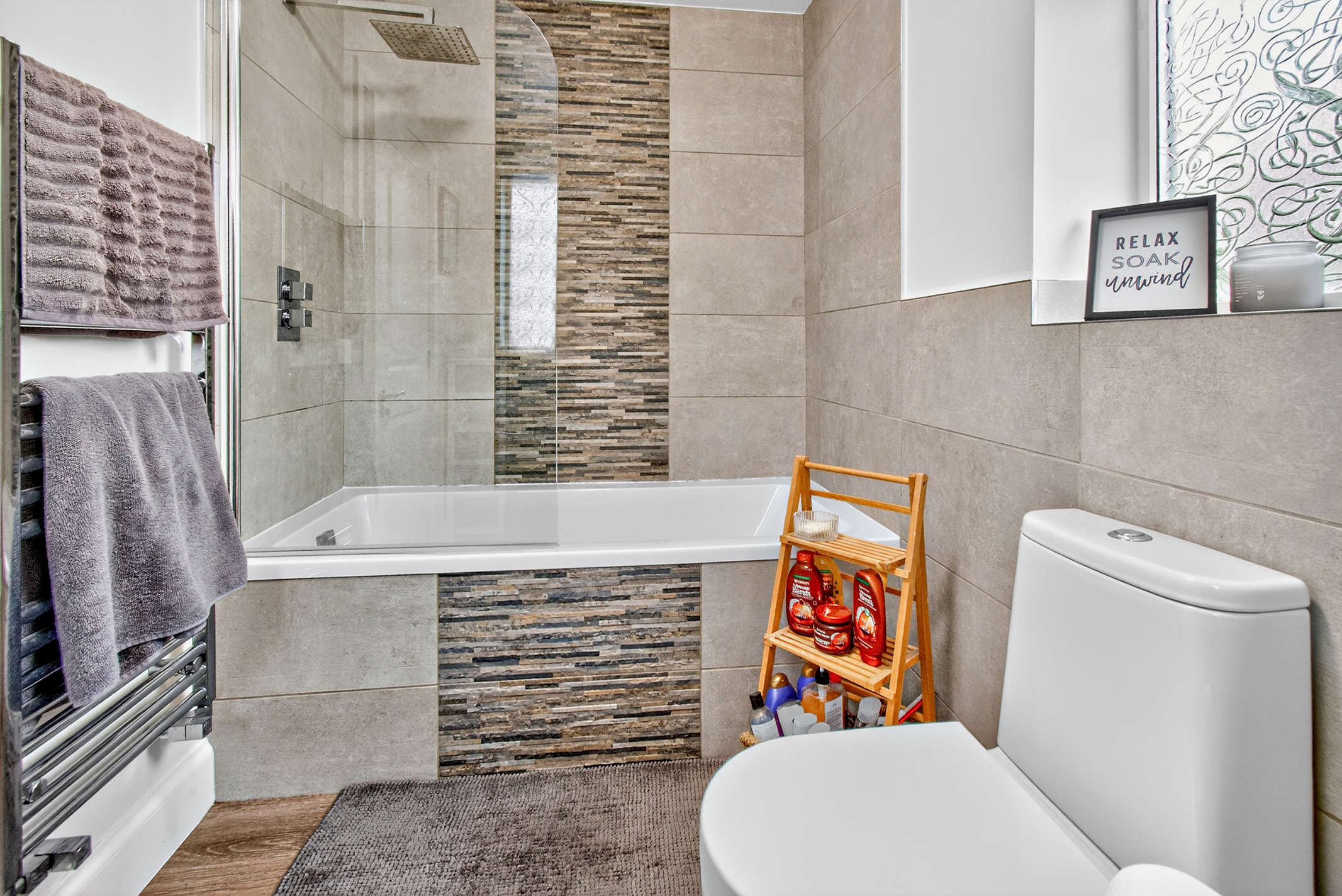 The first-floor bathroom is fully-equipped with a toilet, wash hand basin and a bath with overhead shower facilities, featuring stylish decorative tiling.