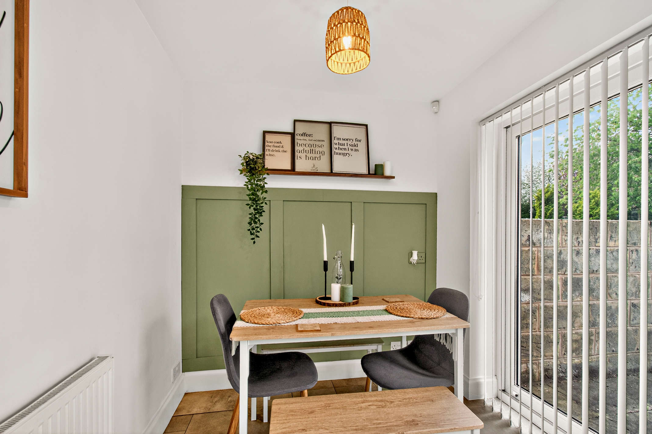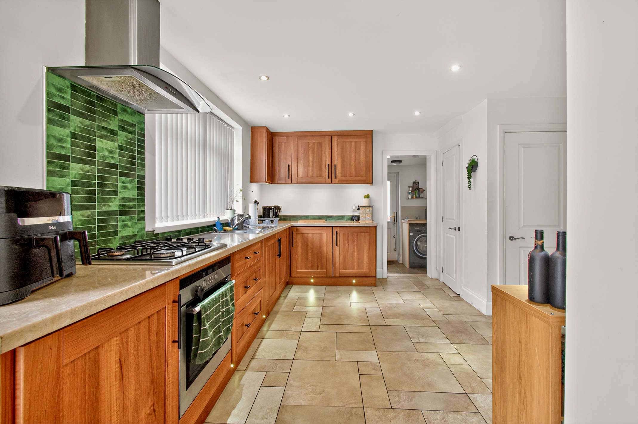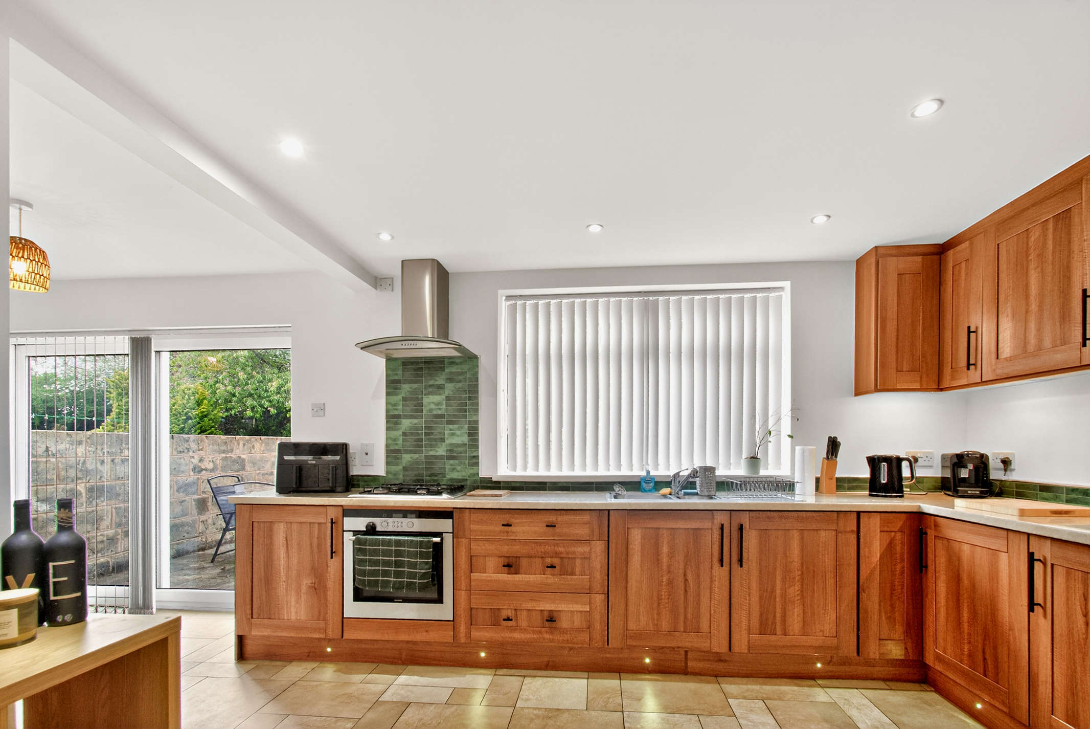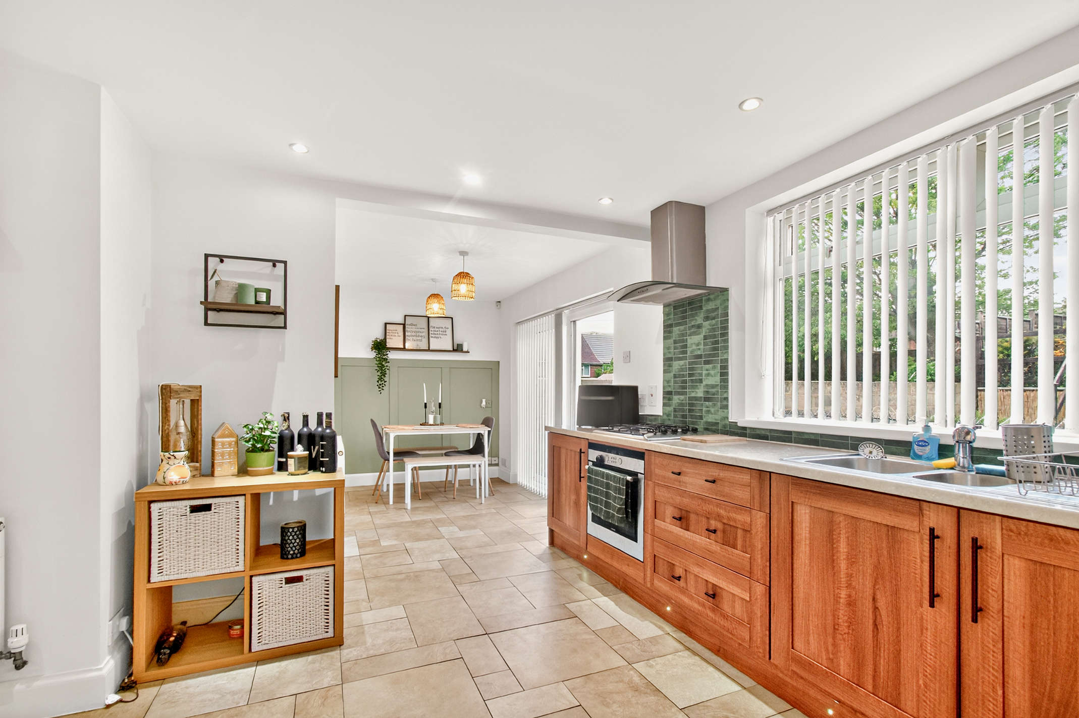 This expansive open-plan space is fully-fitted with wood-effect storage units and built-in utilities. The room is finished with a green tiled backsplash and tiled flooring, while the dining area offers sliding door access to the rear garden.