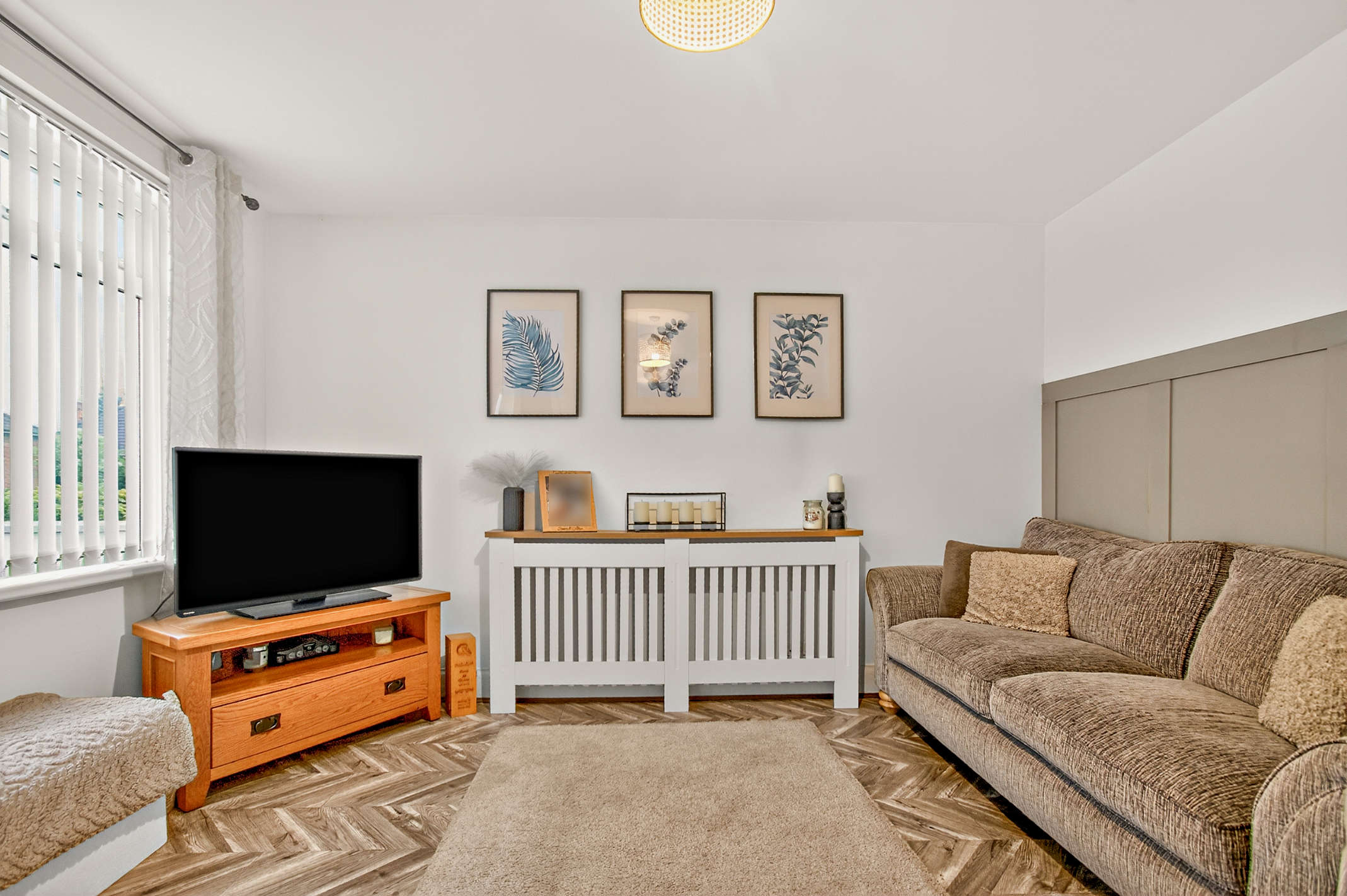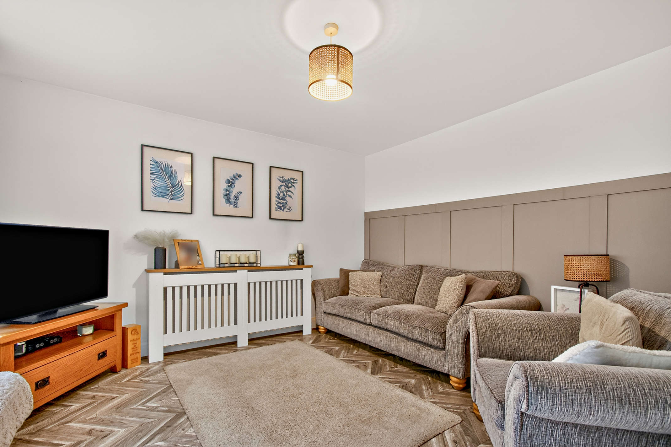 The lounge features modern décor with herringbone-style flooring and an attractive wood-panelled feature wall, with a large front aspect window providing the room with ample natural light.