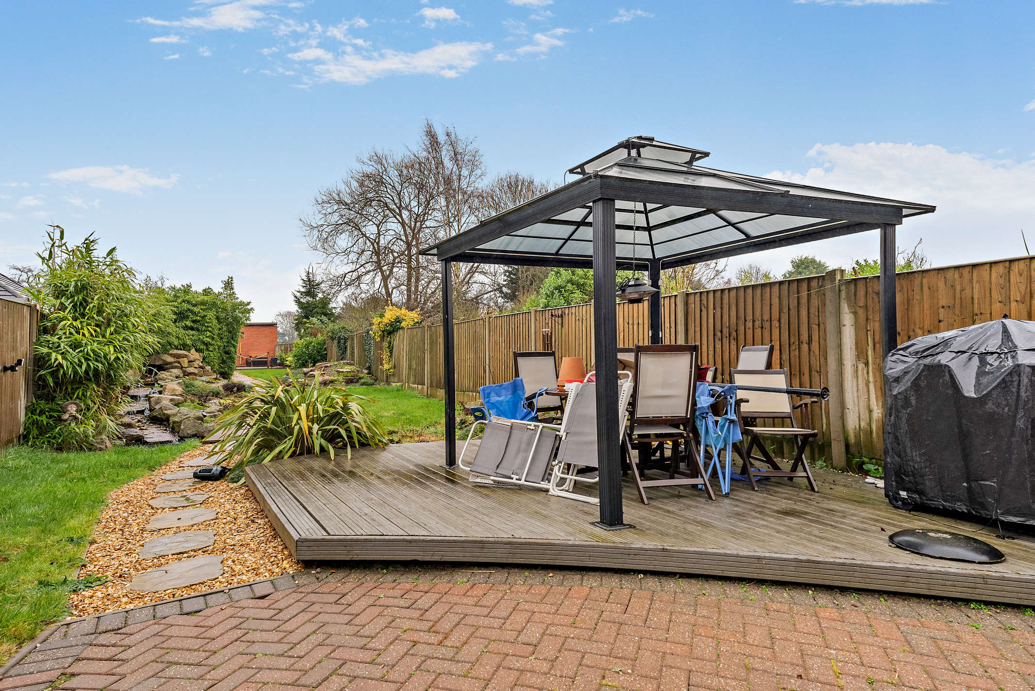 At the front there is a generous paved driveway with space for multiple vehicles. The generous rear garden is accessed via the kitchen. It features a paved area and a decked gazebo seating area for al fresco dining. A stone pathway leading to the annexe at the far, is framed by mature shrubs, screening, and decorative rock features.