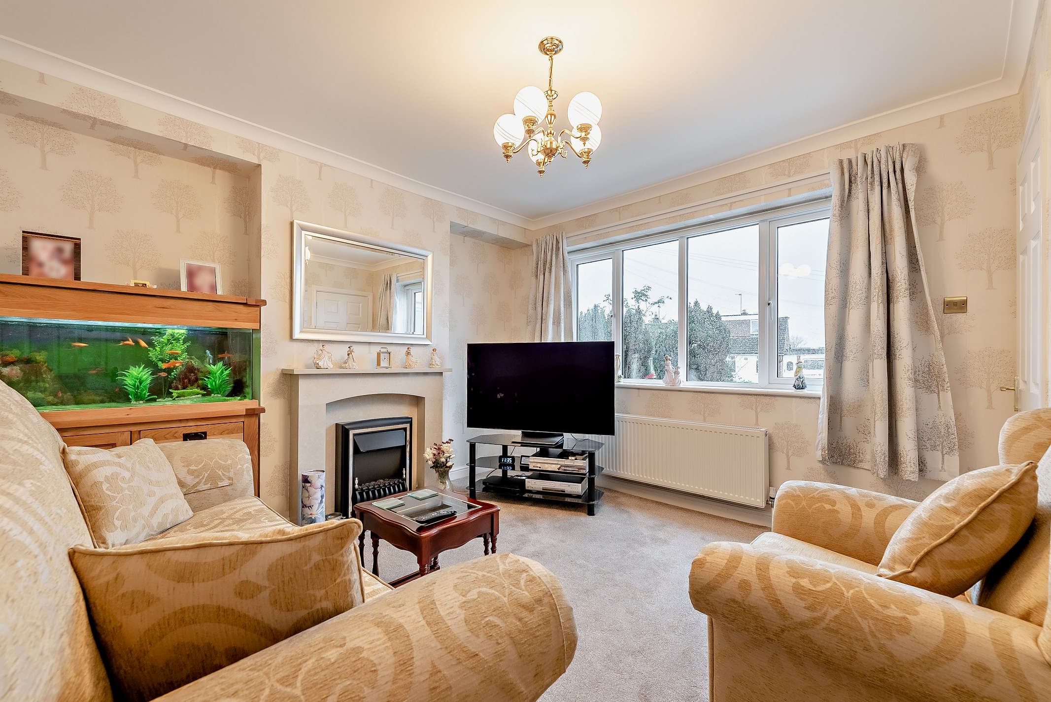 A welcoming reception space with carpeted flooring, a fireplace and a front aspect window.