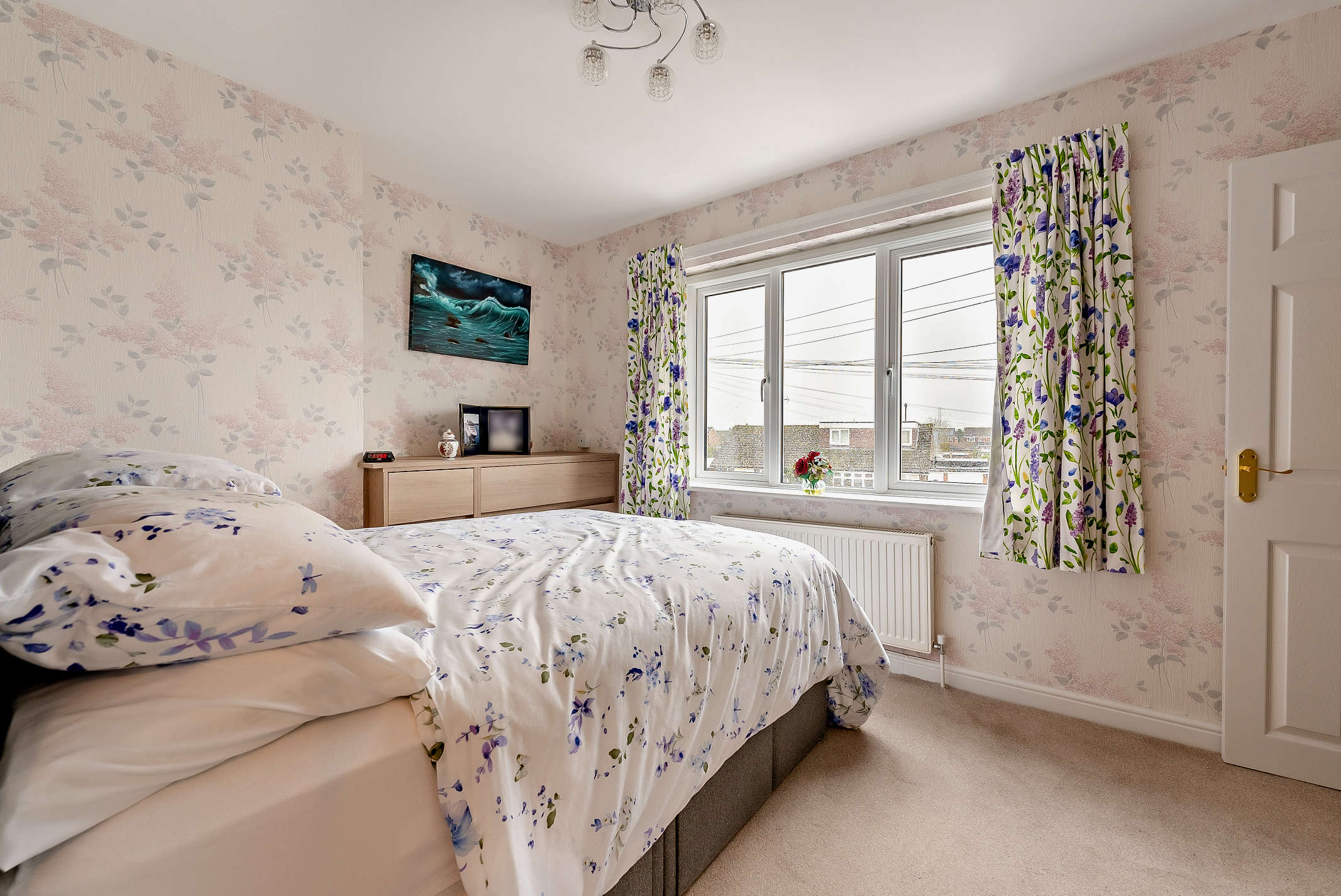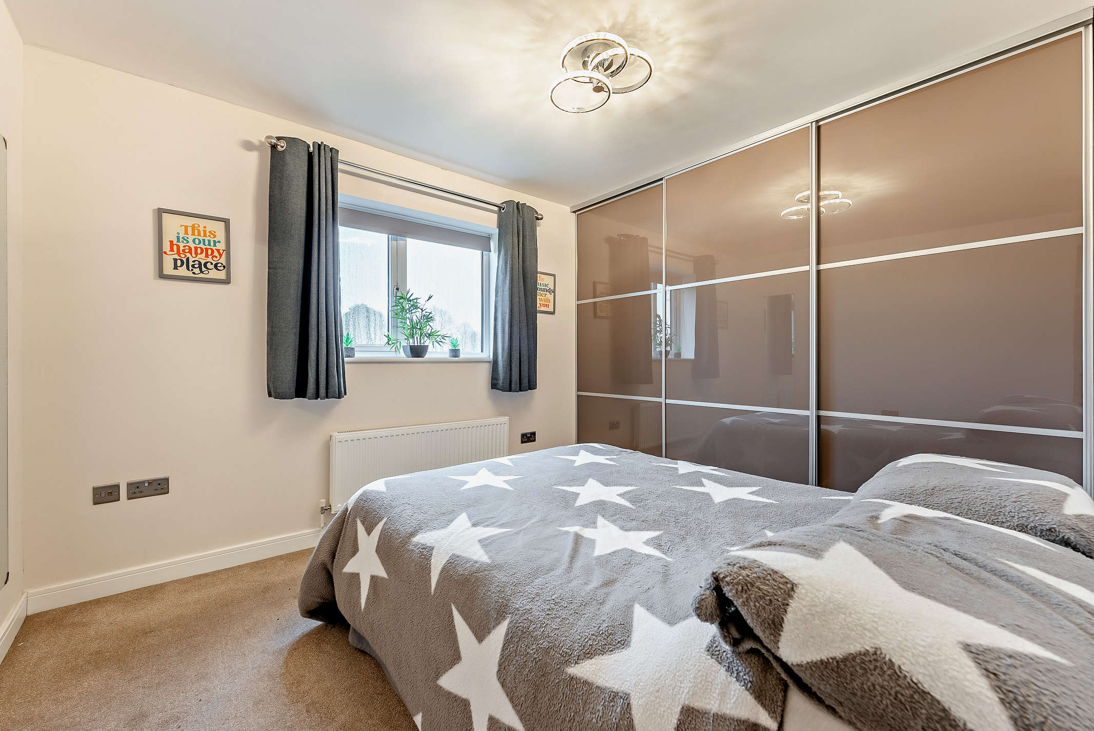 A well-sized double bedroom with a rear aspect window, carpeted flooring, and ample built in storage space.