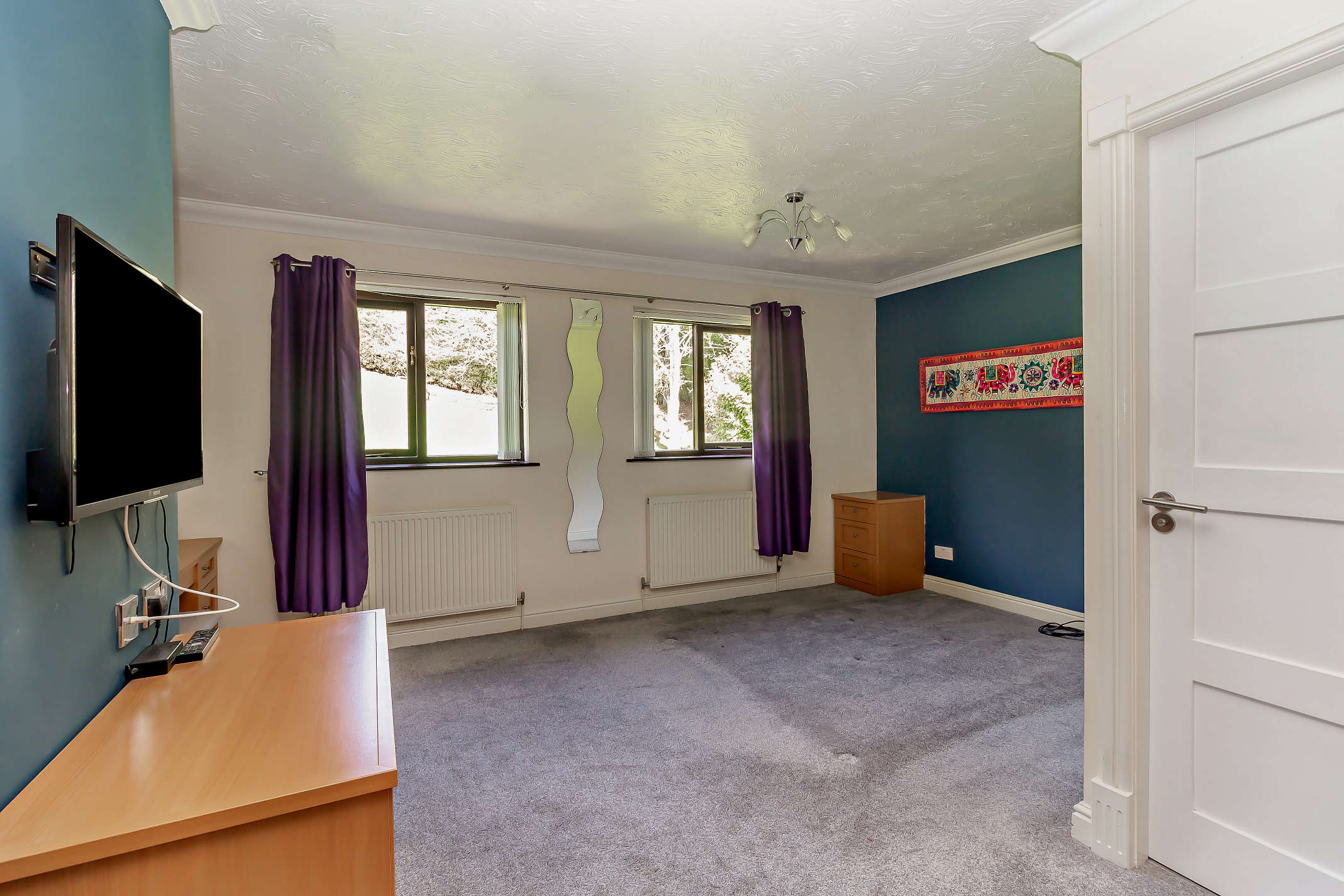 This is a spacious double bedroom with carpeted flooring, en suite facilities, built in wardrobes and beautiful garden views.