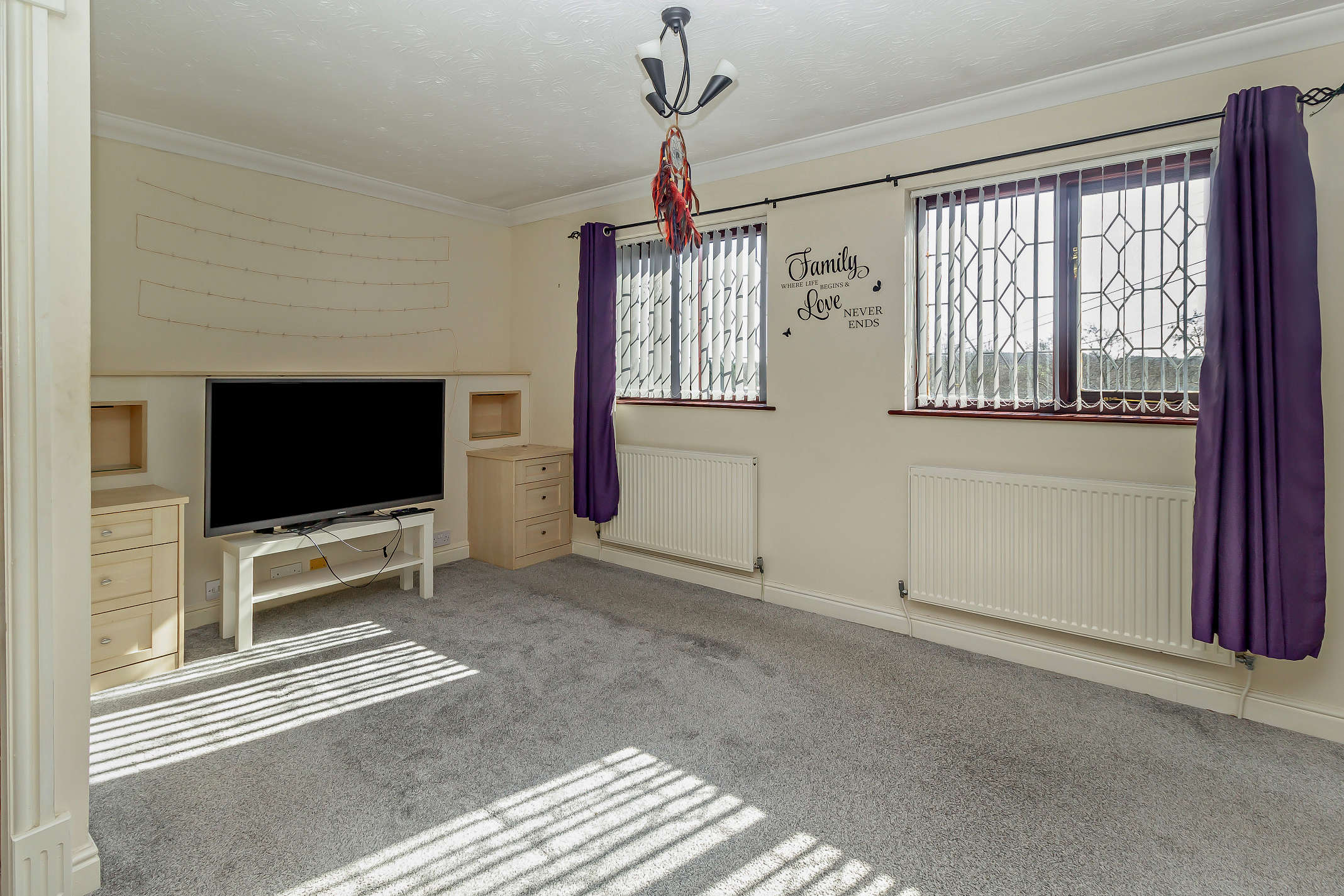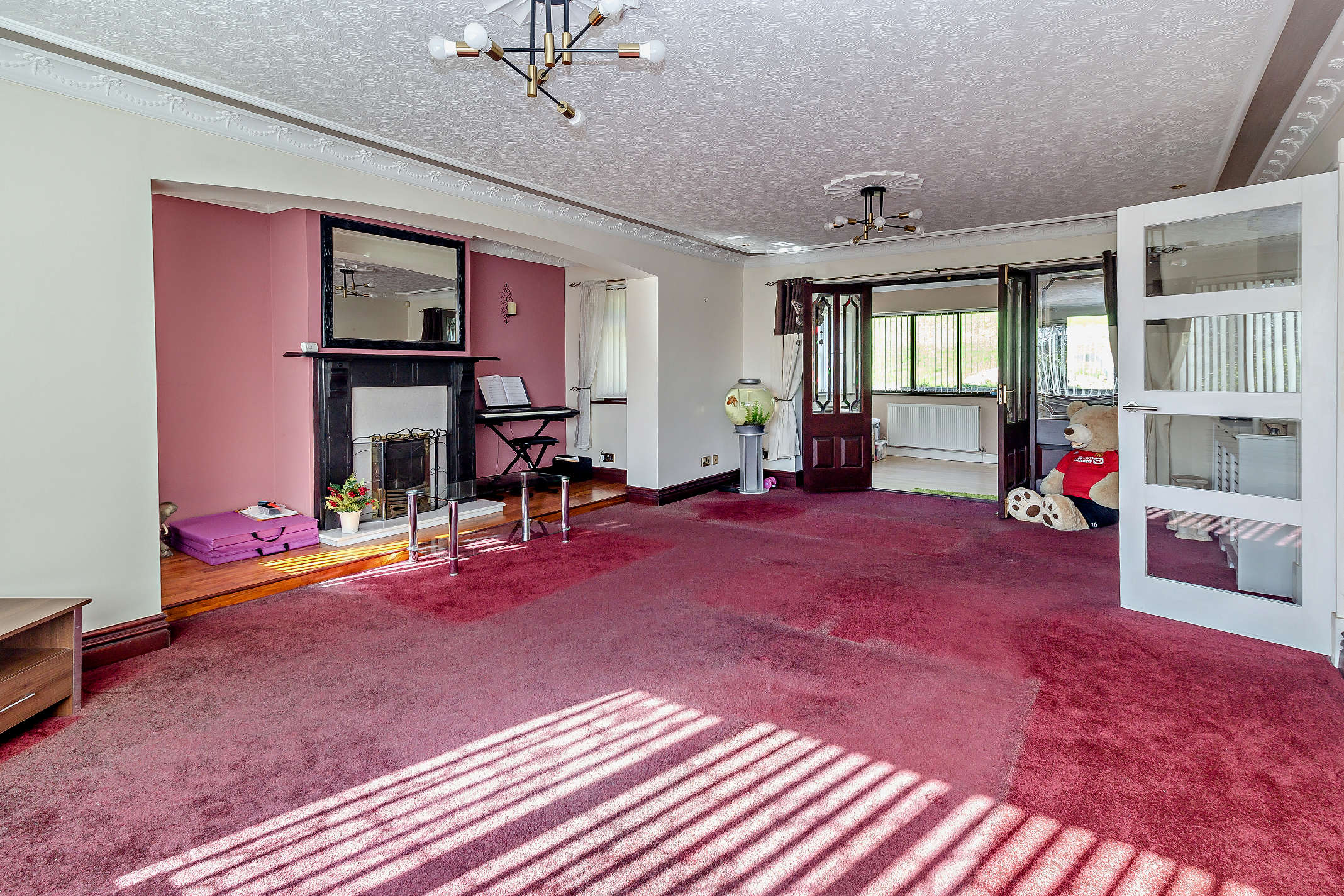 This is a spacious, carpeted reception that offers a feature fireplace set into an arched inglenook with windows to either side. Twin doors open to the hallway and French doors open the conservatory.