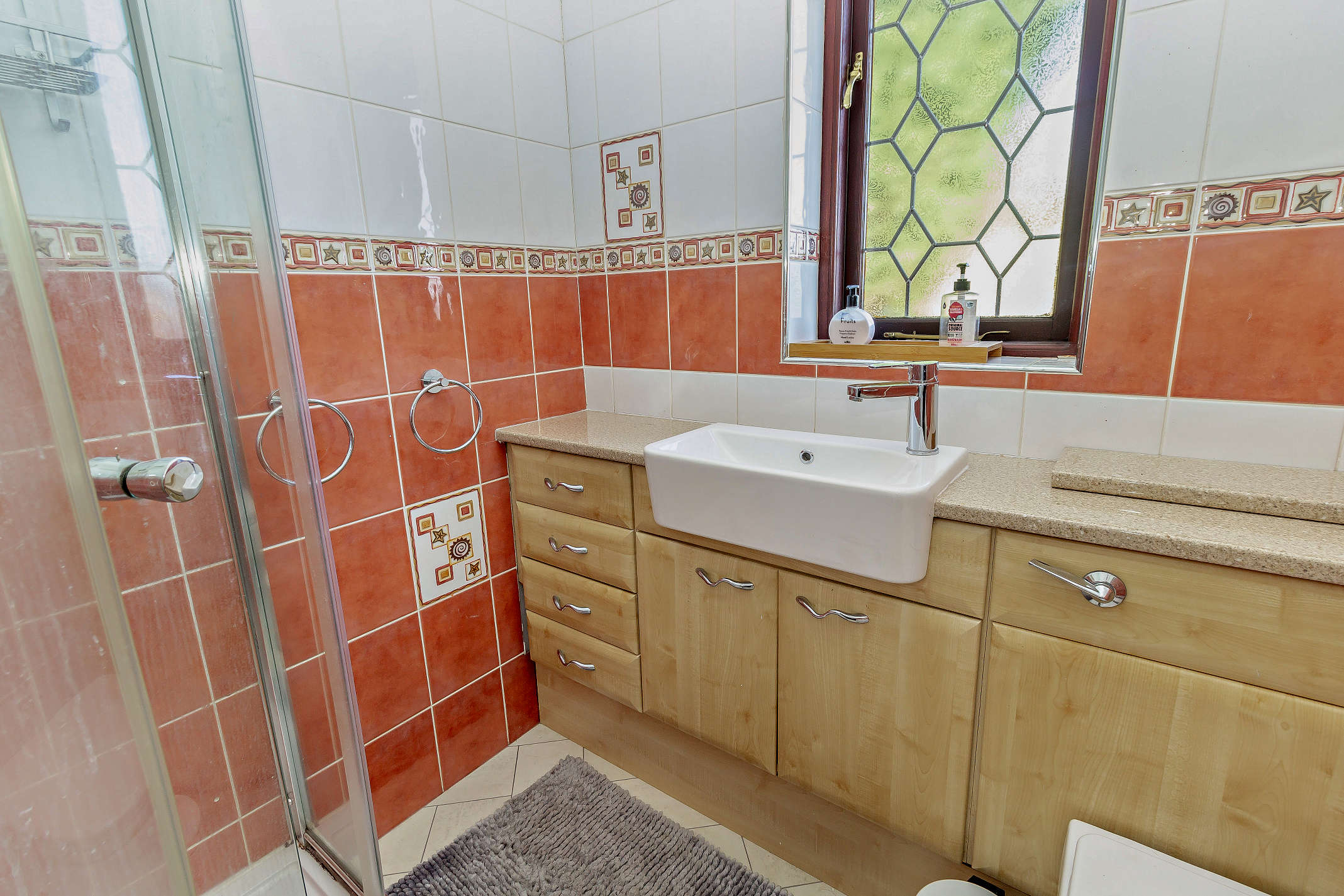 The tiled family bathroom comprises a white three-piece bathroom suite along with a walk-in shower enclosure.