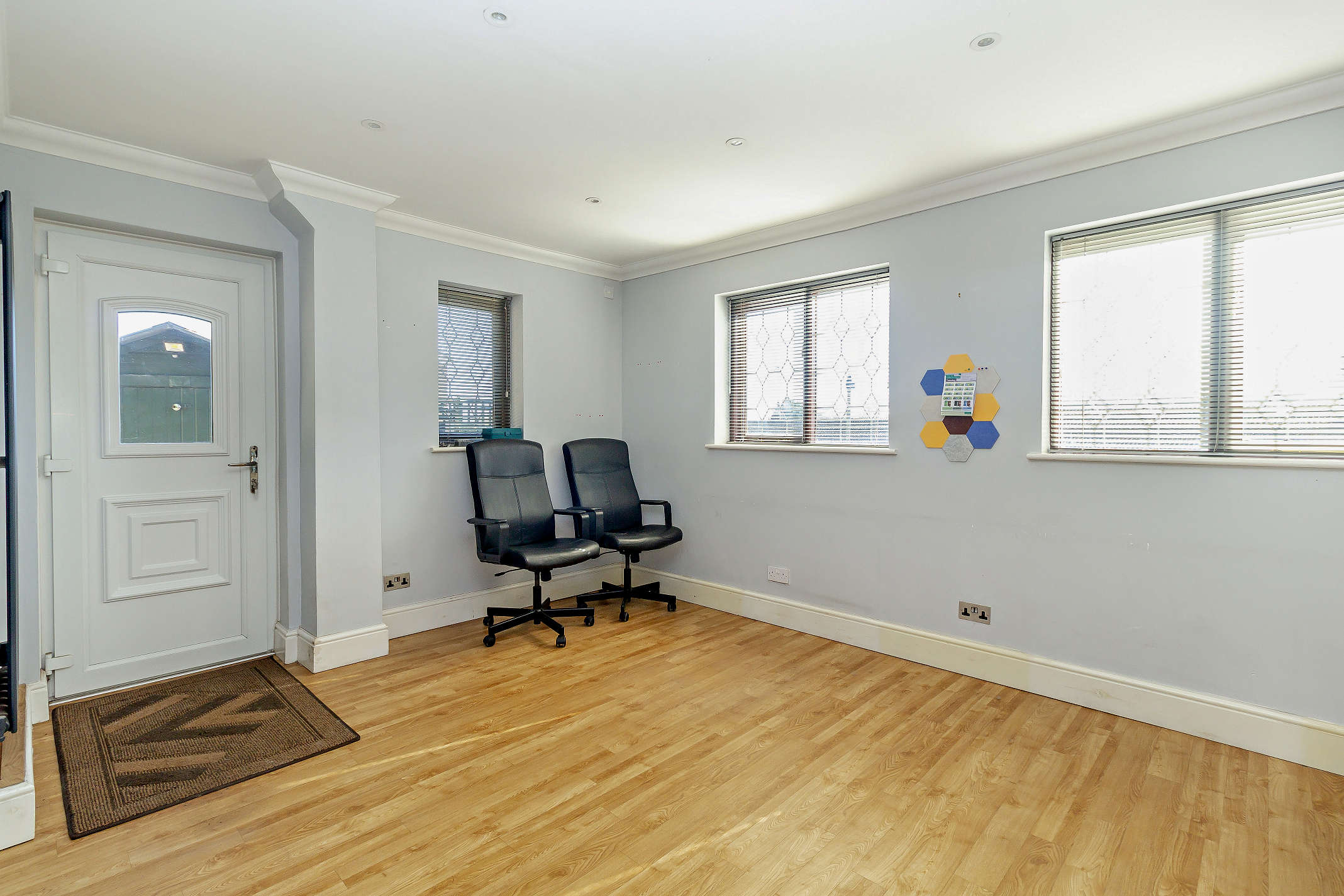A spacious room with a dual aspect view and laminate flooring. A door opens to the kitchen from this room as well as to the outdoors.