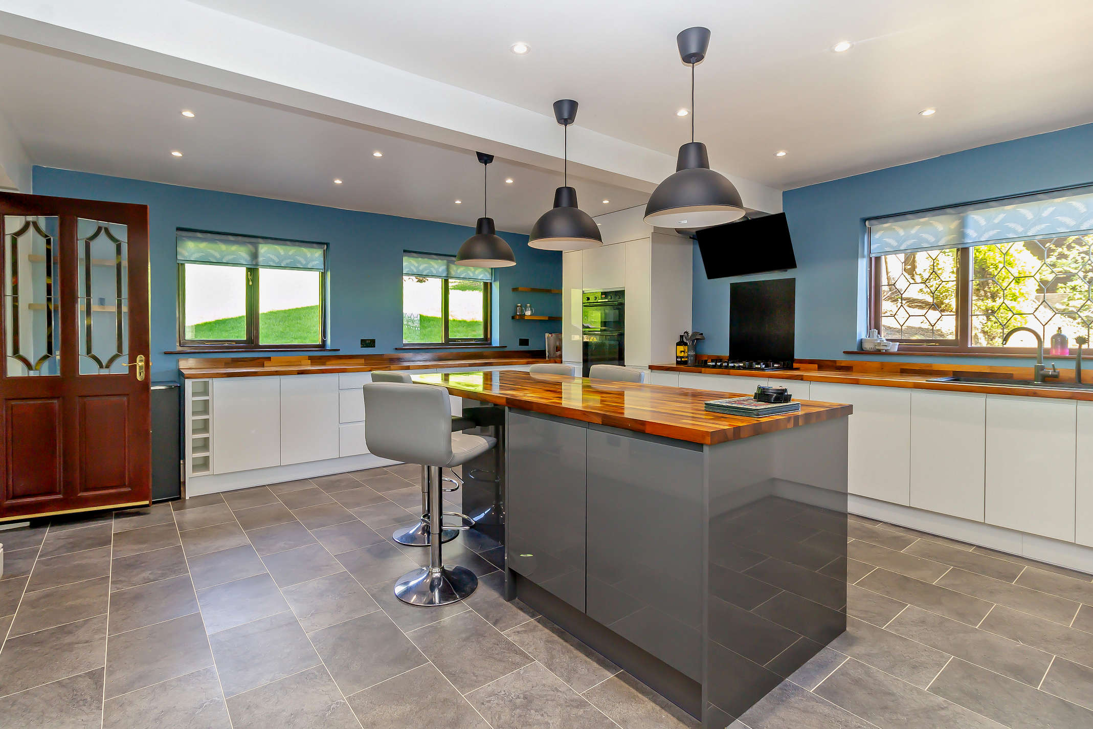 This is a dual aspect, well-proportioned kitchen with a feature central island and a breakfast bar with focus lighting. There are ample gloss wall and base cabinets with integrated appliances (fridge,freezer and a dishwasher) and complementary solid wood worktops as well as floor tiling.