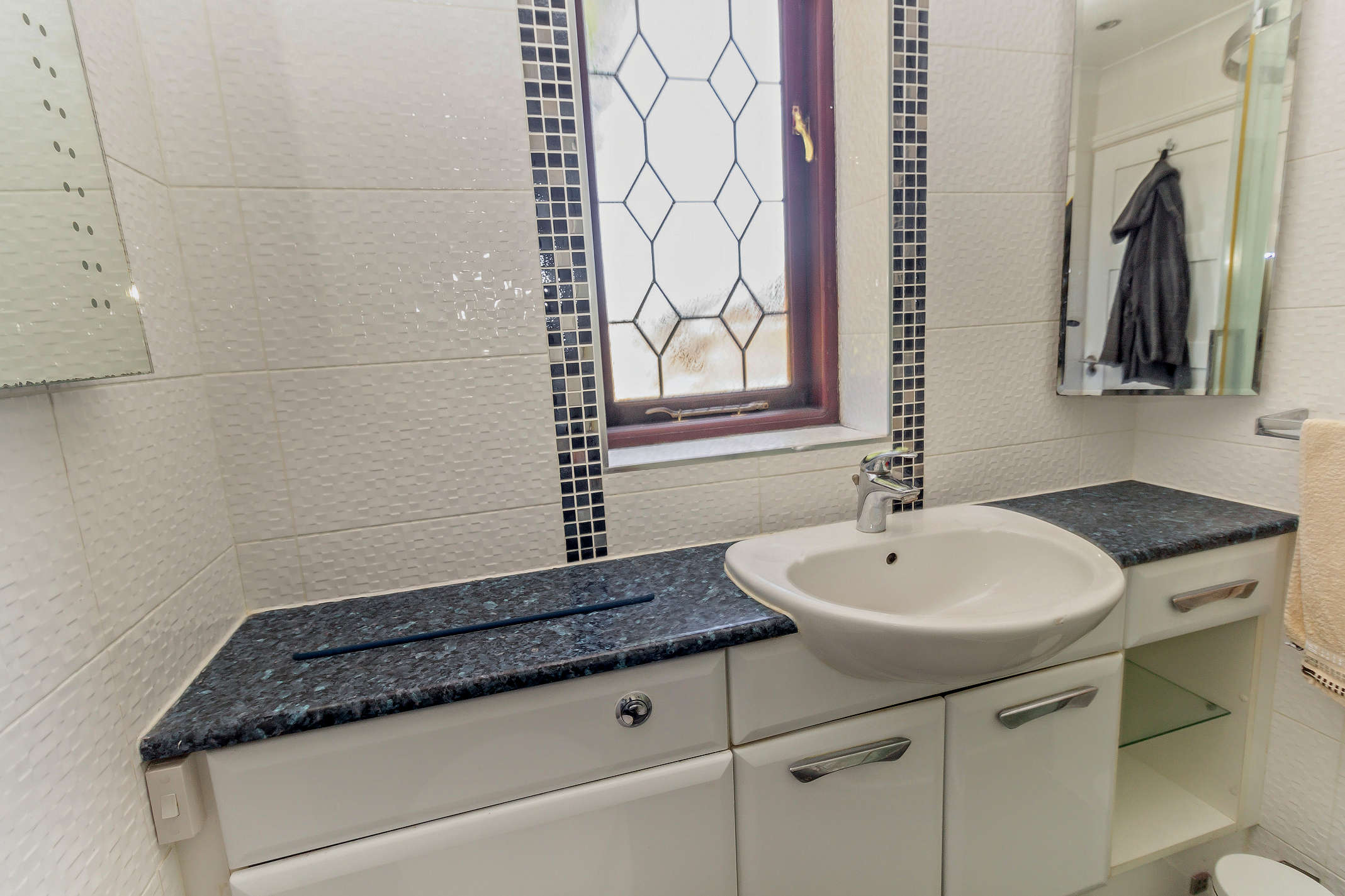 The modern en suite shower room comprises a walk-in shower, white vanity washbasin with integrated storage and a WC.