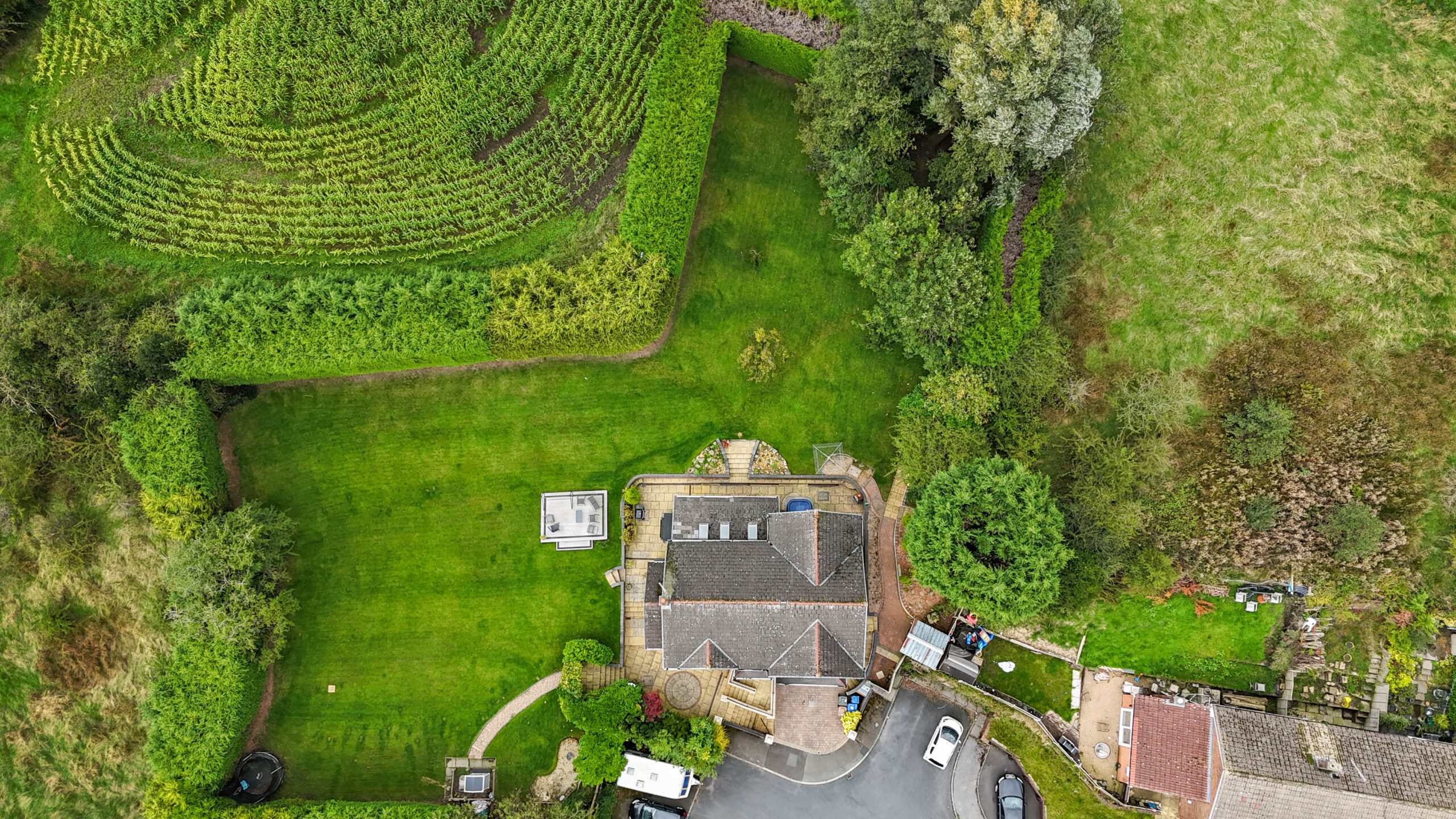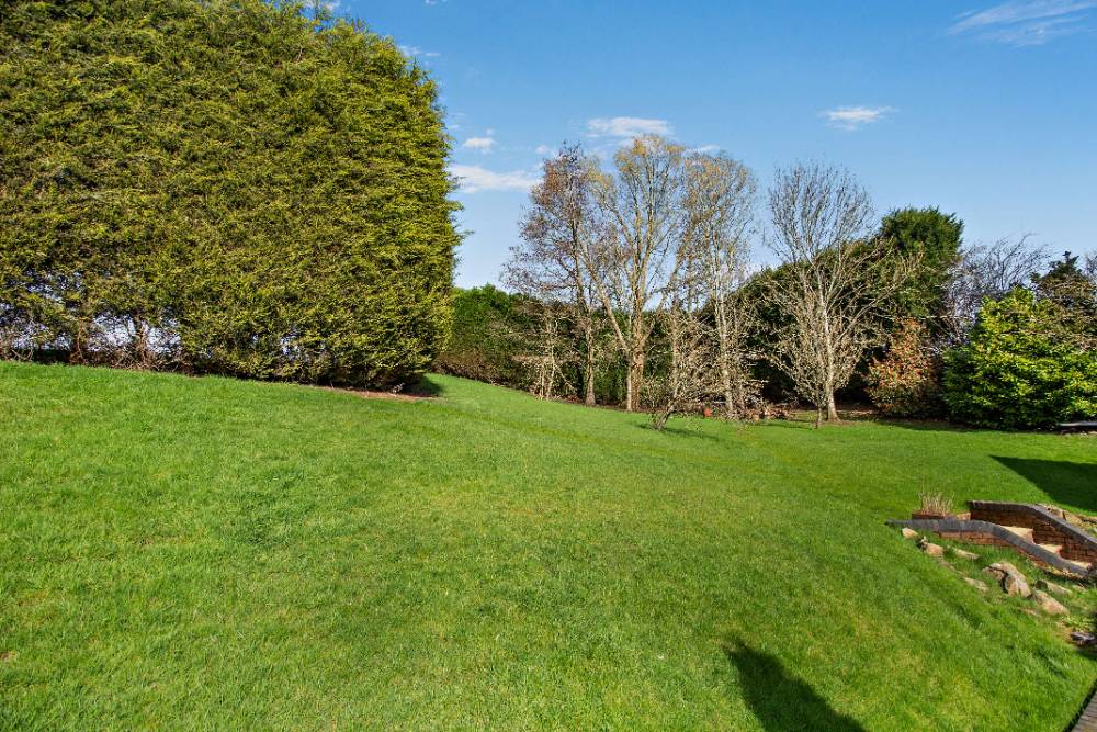 The property is approached via a block paved driveway leading to the garage, with gated steps rising to the covered entrance. To the side, a gate provides pedestrian access to the rear garden — a spectacular haven of rolling lawn, mature trees and seating areas, complemented by a raised deck and paved terraces on both sides.