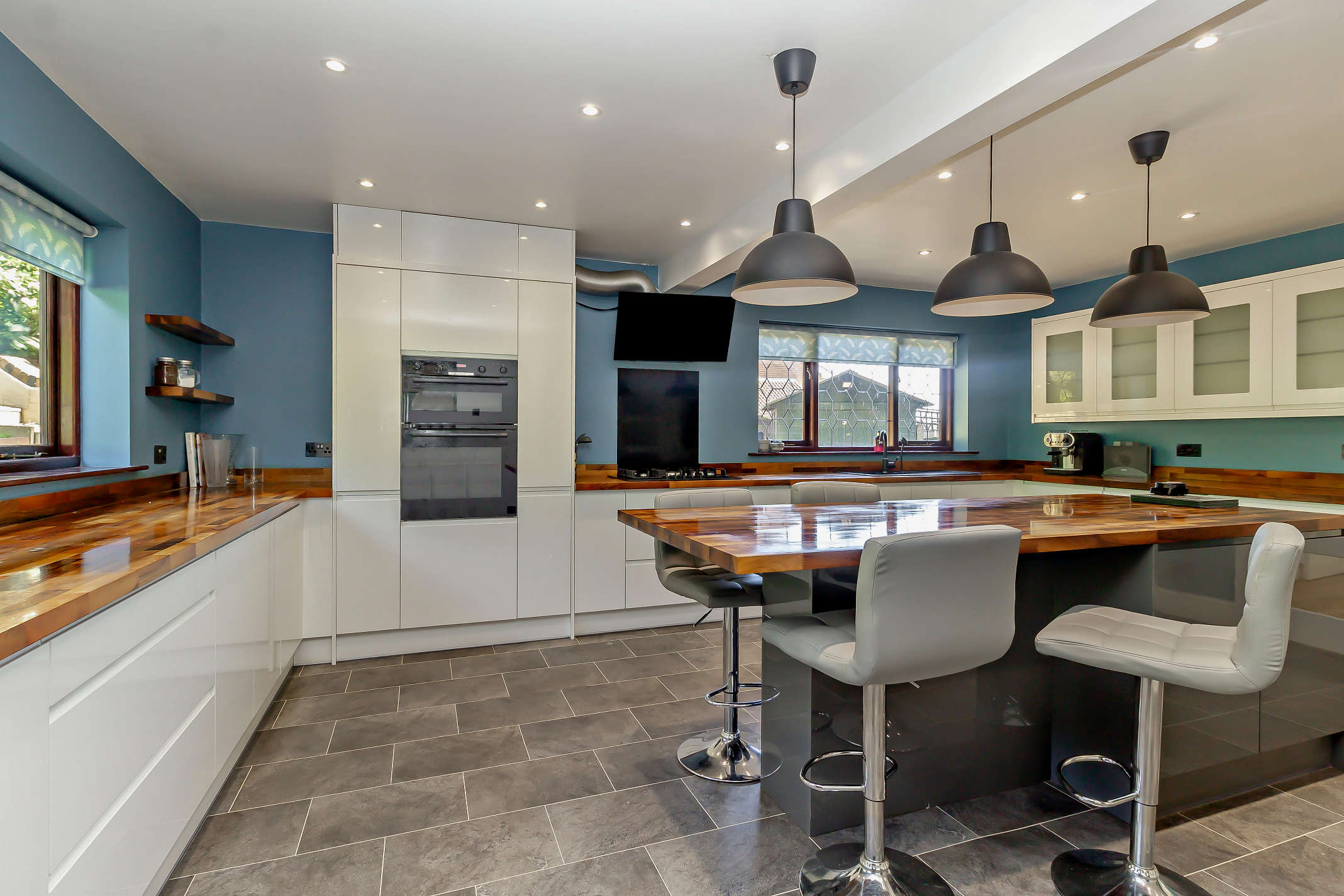 This is a dual aspect, well-proportioned kitchen with a feature central island and a breakfast bar with focus lighting. There are ample gloss wall and base cabinets with integrated appliances (fridge,freezer and a dishwasher) and complementary solid wood worktops as well as floor tiling.