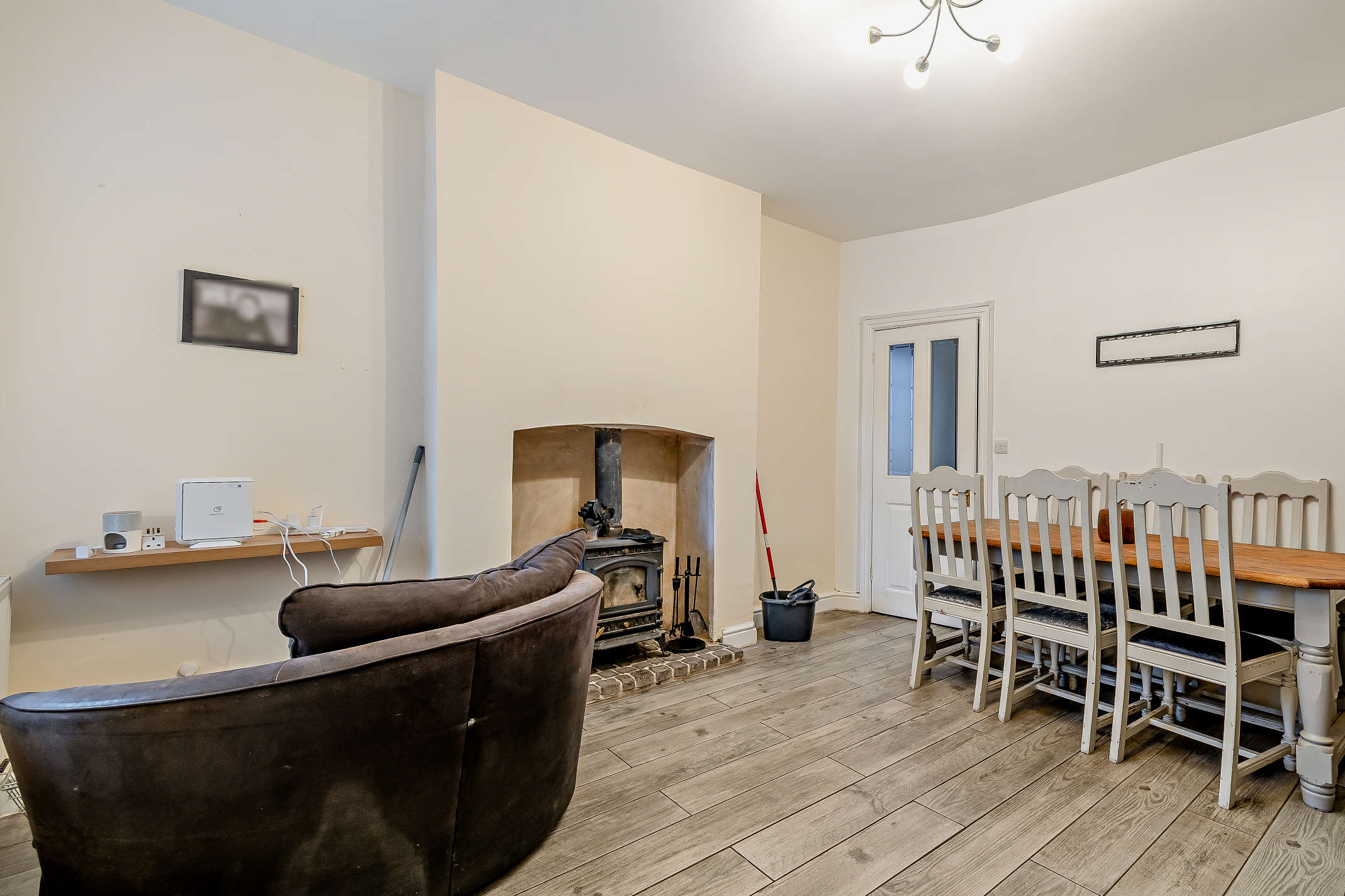 The dining room has laminate flooring, a feature wood-burning stove, in-built storage and garden views.