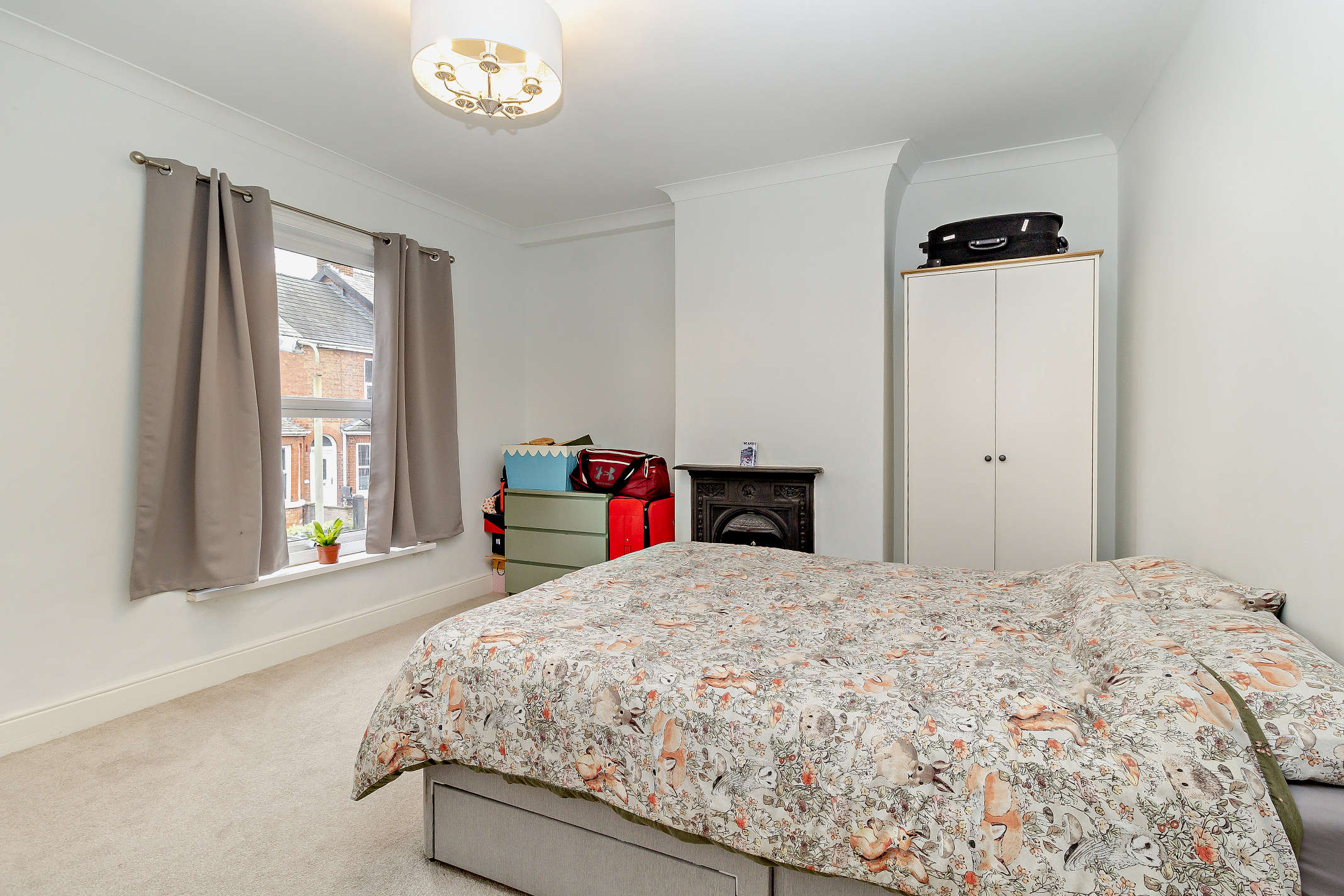On the first floor, this spacious double bedroom offers a feature period fireplace, carpeted flooring, and a front aspect view.