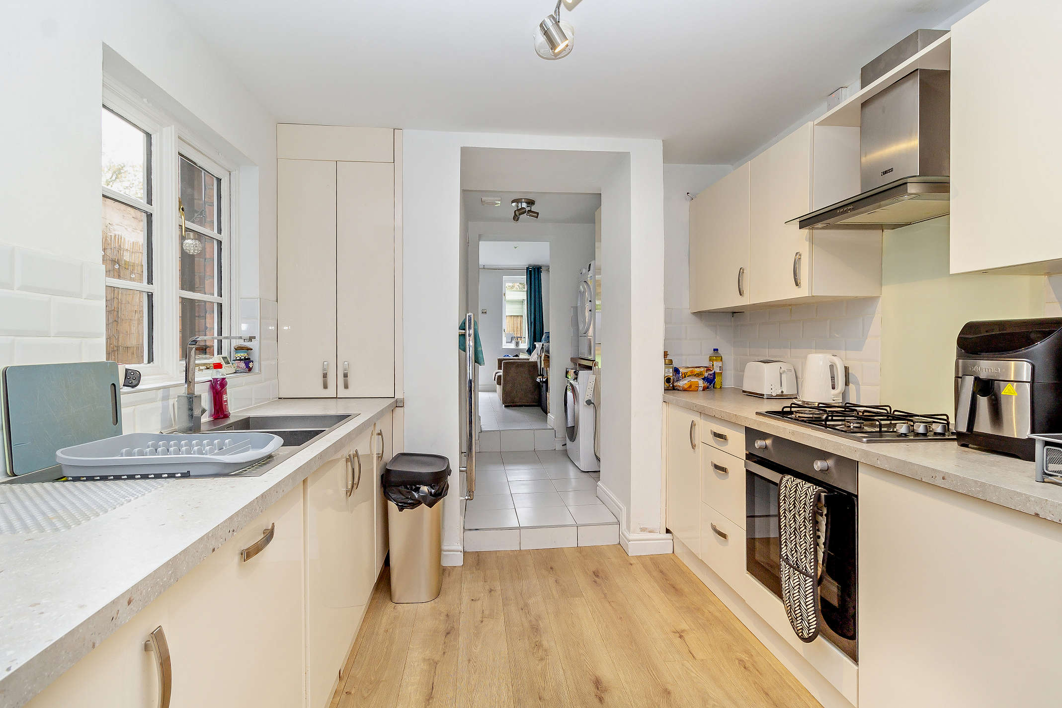 The kitchen is light-filled and offers wall, base and drawer cabinets along with in-built storage. There are integrated appliances and a stainless steel extractor hood as well as wooden-style flooring throughout.