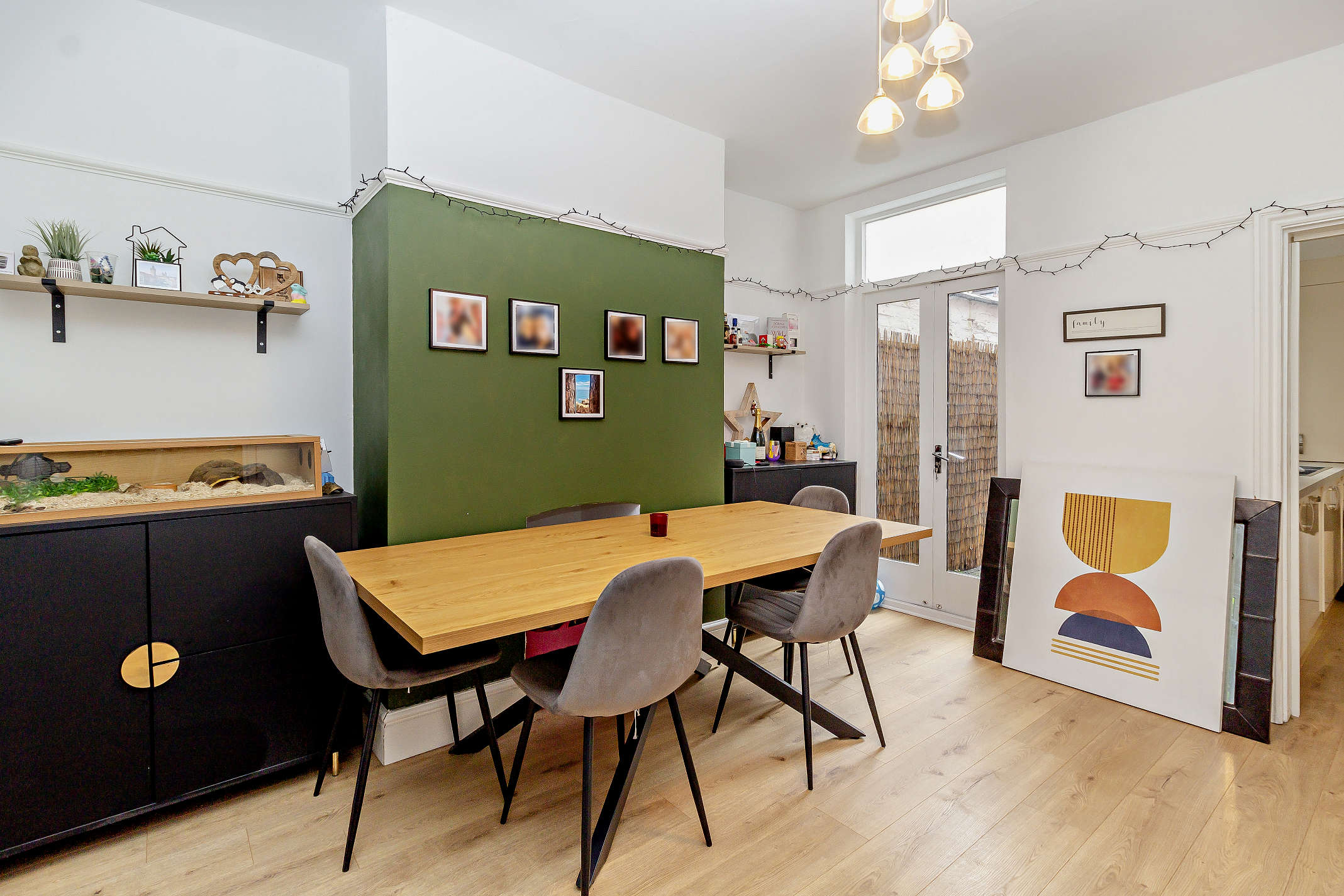 The separate diner is spacious with a fireplace niche, in-built storage, wooden-style flooring, and French doors opening to the garden.